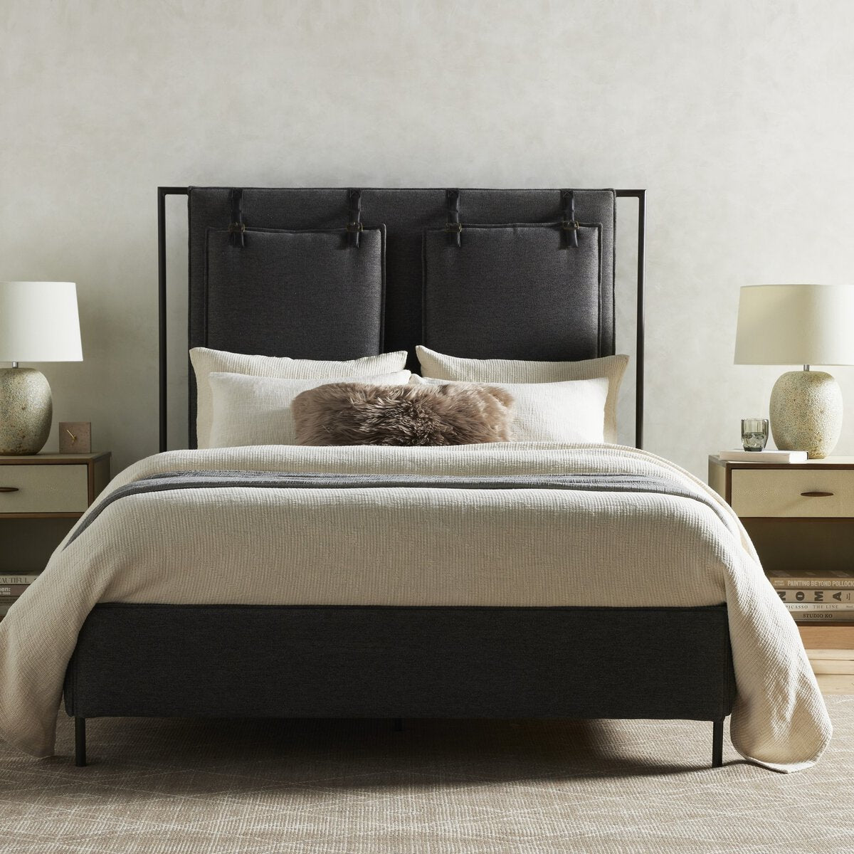 Overall Dimensions 80.75"w x 84.50"d x 60.25"hItem Number 105885-008Colors Hockney Ivory, Waxed Black (PC), Sierra ButterscotchMaterials 86% Polyester, 14% Flax/Linen, Iron, Faux LeatherFabric PerformanceWeight 171.30 lbVolume 28.43 cu ftClearance from Footboard 5.12"Clearance from Headboard 5.12"Clearance from Side Rails 5.12"Footboard Height 15.94"Footboard Thickness 2.24"Footboard Width 78.74"Headboard Height 60.24"Headboard Thickness 4.25"Headboard Width 78.74"Interior Dimension for Mattress Depth 81.10"Interior Dimension for Mattress Height 10.24"Interior Dimension for Mattress Width 78.34"Side Rails Height 10.83"Side Rails Length 81.30"Side Rails Thickness 2.01"Adjustable Bed Frame Compatible YesBed Backing Dark FabricBed Material UpholsteredBox Spring Required Standard Box SpringCleaning Code