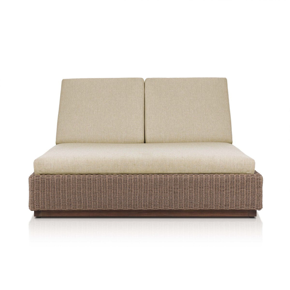 A slim, stylish profile made for lounging. A woven box base frames durable, outdoor-friendly cushioning in soft buff. An adjustable back offers personalized comfort, while a wooden plinth elevates this sleek design. Cover or store indoors during inclement weather and when not in use.