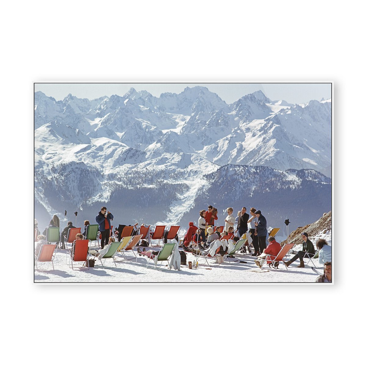 Holidaymakers in sun loungers on the slopes at Verbier, Switzerland, February 1964. This specially selected work from the late influential photographer Slim Aarons is printed using ultra-modern ChromaLuxe technology for the first time ever. High in definition and gloss, images are printed in vibrant, saturated color on fade- and scratch-resistant recycled aluminum. Each is float-mounted with hand-selected framing designed to complement the print. Handmade in Austin, Texas, each piece includes a certificate of authenticity commemorating the partnership between Slim Aarons, Getty Images Gallery and Four Hands Art Studio. Photo courtesy of Getty Images.