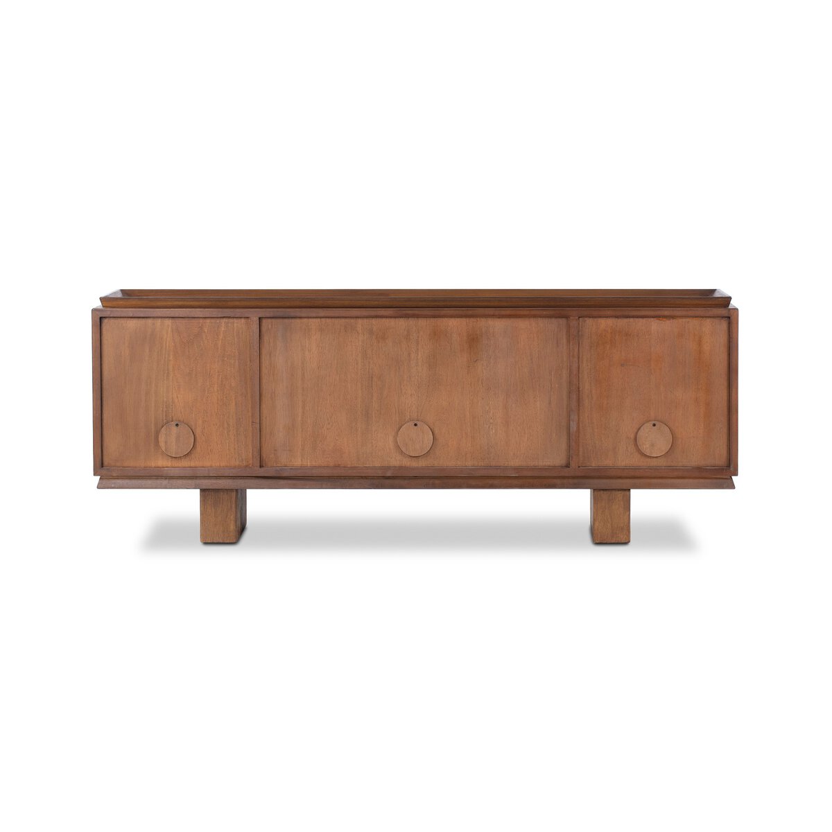 Art Deco-driven media console features textural front doors a tray top and a prominent grid design. Design forward with functional detail, the rust-hued console offers a beautifully unique spot for media components. Rear cutouts for cord management.