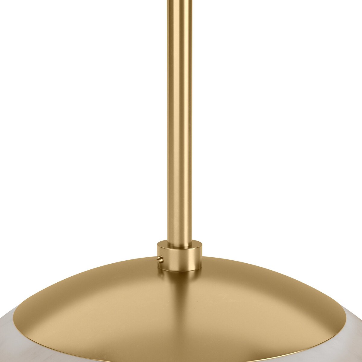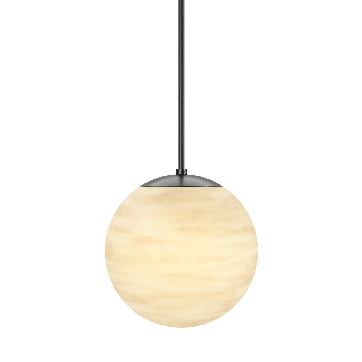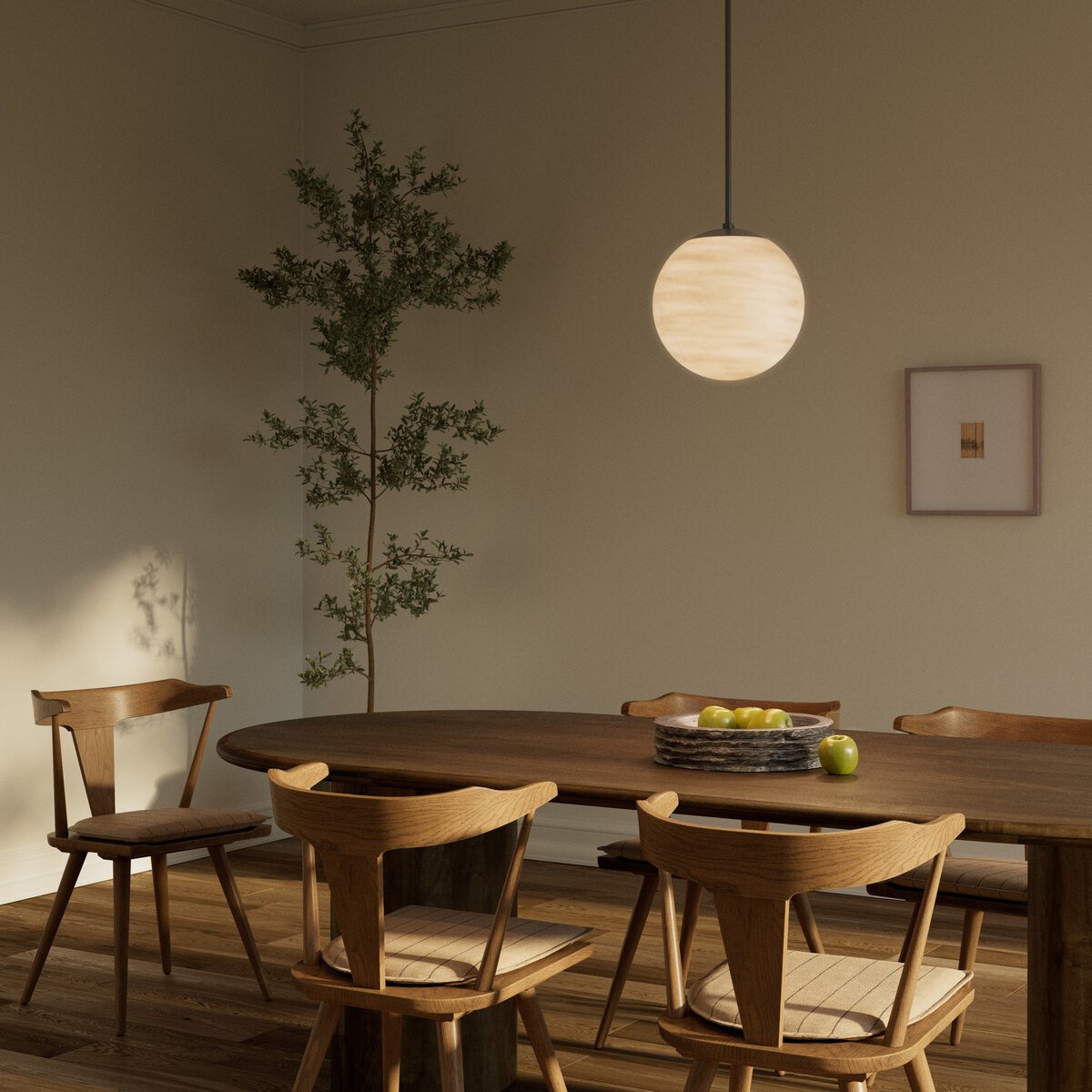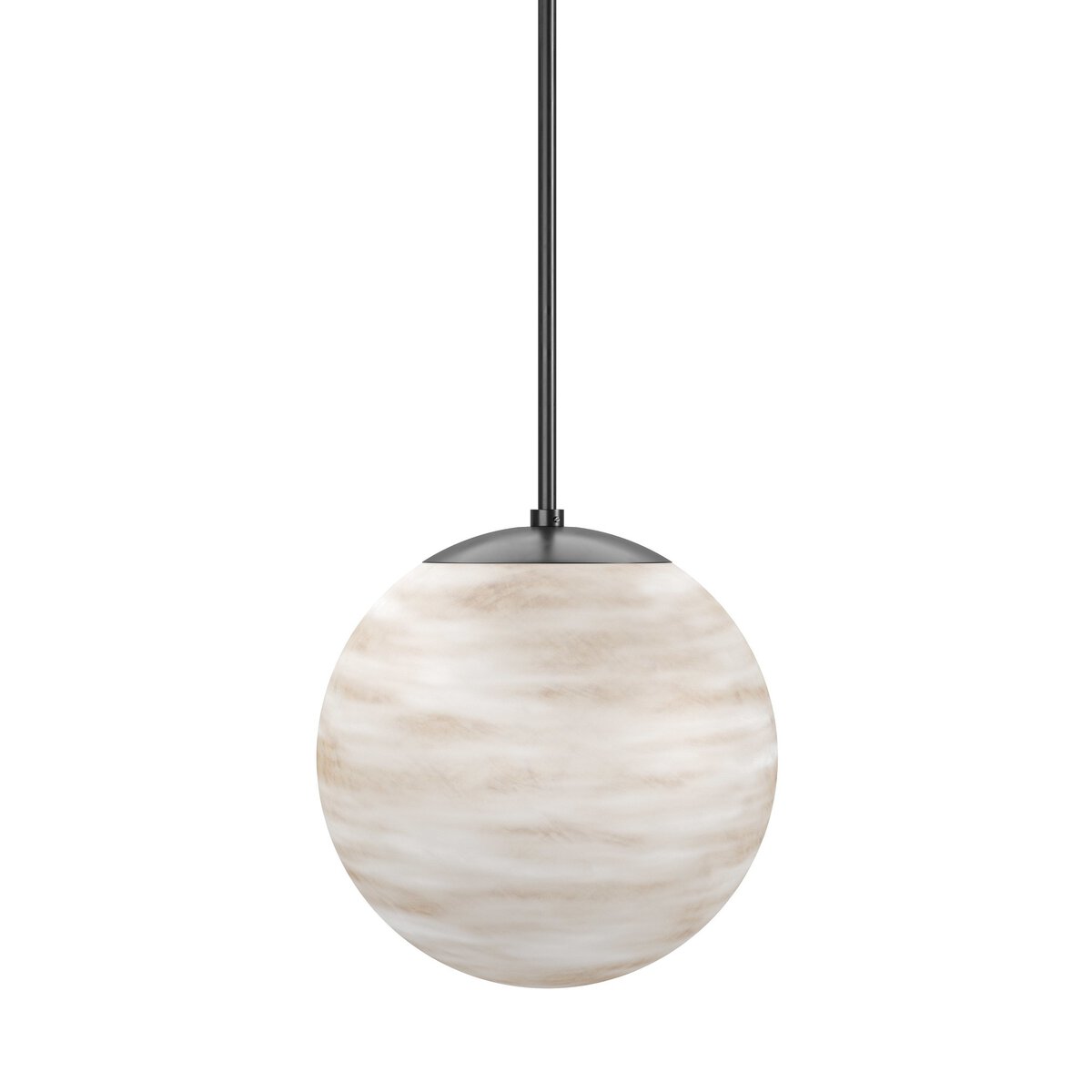 A single marbled glass sphere dangles for a stunning effect. Each matte globe is individually blown, shaped and sculpted by hand through a one-hour process. Burnished brass and glass are 98% recyclable. Designed and sustainably crafted in Poland by Schwung. This piece is compatible with sloped ceilings.