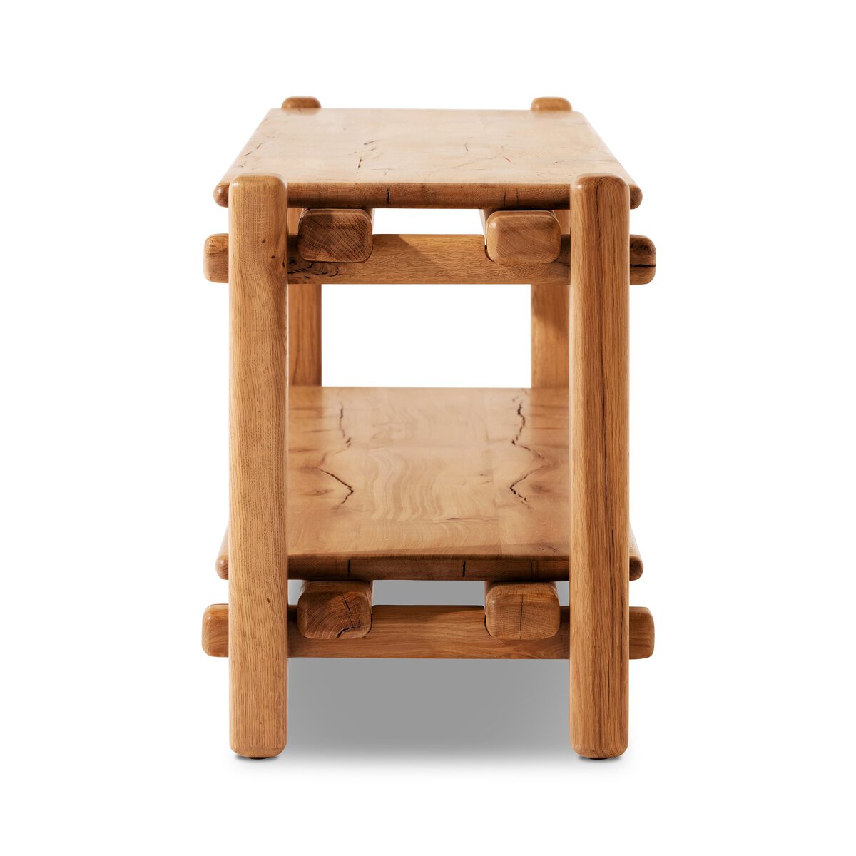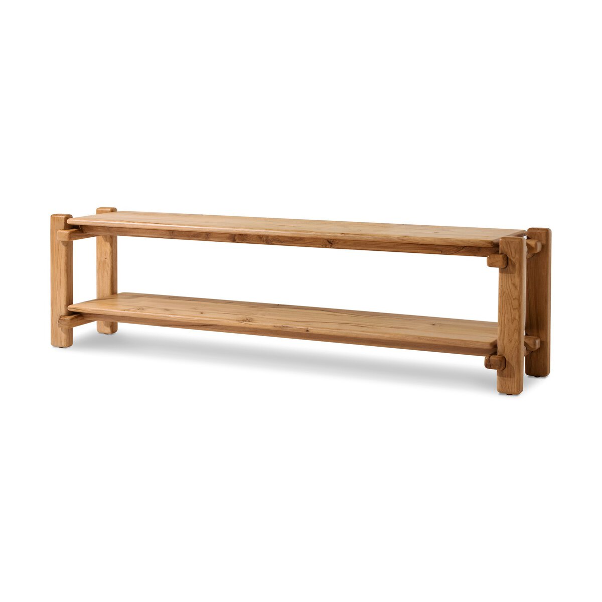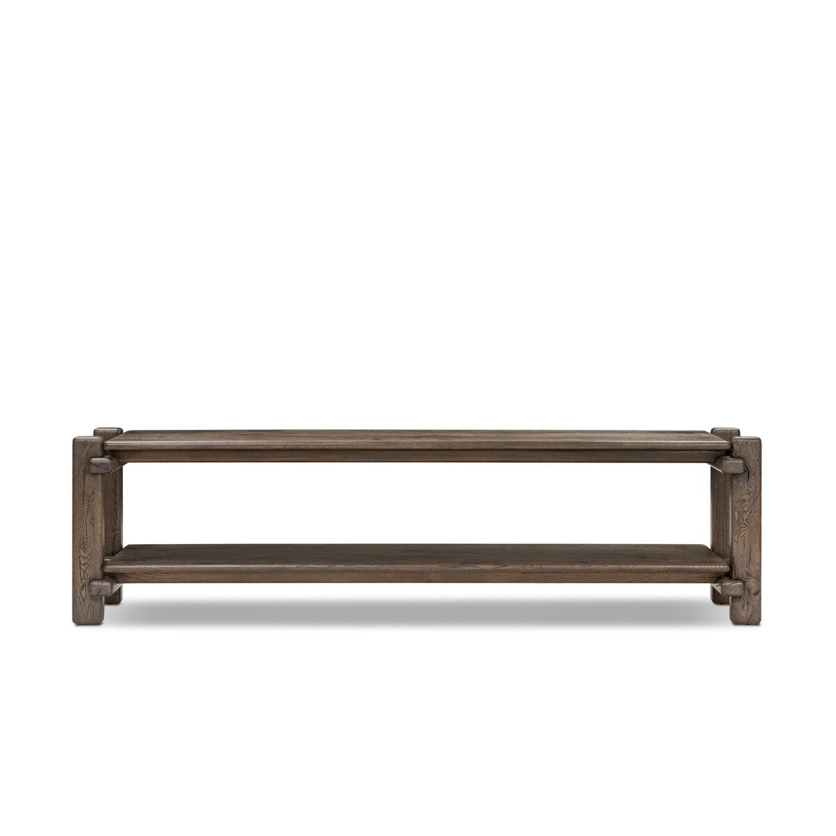 Overall Dimensions 86.75"w x 18.75"d x 24.00"hItem Number 242151-001Colors Natural Reclaimed French OakMaterials Solid Reclaimed OakWeight 171.08 lbVolume 38.99 cu ftClearance from Floor 1 3.98"Distance between Legs (Front to Back) 1 11.73"Distance between Legs (Side to Side) 1 79.29"Fixed Shelf Depth 1 17.95"Fixed Shelf Height 1 1.18"Fixed Shelf Width 1 78.35"Interior Section Depth 1 17.95"Interior Section Height 1 11.50"Interior Section Width 1 78.35"Leg/Base Depth 1 2.36"Leg/Base Height 1 24.02"Leg/Base Width 1 3.78"Tabletop Thickness 1.18"Door Type No DoorsDrawer Glide Type NoneDrawer Stop Material NoneFixed Shelf Qty 1.00Fixed Shelves YesFrame Construction Joinery Corner-block/CleatFrame Construction Joinery Mortise and TenonFunctionality ShelvesHas Leveler YesInterior Section Quantity 1.00Protective Feet Leg LevelersShape Type RectangleSuite MarciaWeight Capacity 200 lb