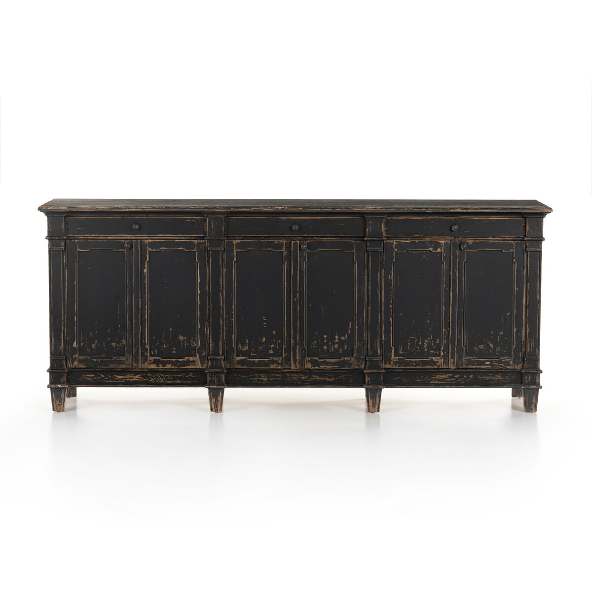 Overall Dimensions 96.25"w x 19.75"d x 39.50"hItem Number 229927-001Colors Distressed Black, Distressed CopperMaterials Solid Pine, Copper CladdingWeight 189.82 lbVolume 59.86 cu ftClearance from Floor 1 4.88"Door Height 1 24.37"Door Height 2 24.37"Door Thickness 1 1.25"Door Thickness 2 1.50"Door Width 1 13.23"Door Width 2 14.06"Drawer Depth 1 13.50"Drawer Height 1 2.56"Drawer Width 1 25.39"Interior Section Depth 1 14.76"Interior Section Depth 2 14.76"Interior Section Height 1 24.37"Interior Section Height 2 24.37"Interior Section Height 3 24.37"Interior Section Width 1 30.51"Interior Section Width 2 29.49"Interior Section Width 3 30.51"Removable Shelf (Fixed or Adjustable) Depth 1 14.76"Removable Shelf (Fixed or Adjustable) Depth 2 14.76"Removable Shelf (Fixed or Adjustable) Height 1 0.71"Removable Shelf (Fixed or Adjustable) Height 2 0.71"Removable Shelf (Fixed or Adjustable) Width 1 29.49"Removable Shelf (Fixed or Adjustable) Width 2 30.51"Cord Management YesDoor Closure Catch Type Ball-and-catchDoor Qty 6.00Door Type HingedDrawer Glide Color WoodDrawer Glide Type Sidemount WoodDrawer Quantity 3.00Drawer Stop Anti Tip Rail YesDrawer Stop Material WoodFrame Construction Joinery Corner-block/CleatFrame Construction Joinery Mortise and TenonFrame Construction Joinery Pocket Joint with ScrewsFunctionality DoorsFunctionality DrawersFunctionality ShelvesHas Leveler YesHinge Type BarrelInterior Section Quantity 3.00Protective Feet Leg LevelersRecommended Shelf Capacity (kg) 18.14Recommended Shelf Capacity (lbs) 40.00Removable Shelf YesRemovable Shelf Qty 3.00Suite MarjorieWeight Capacity 200 lb