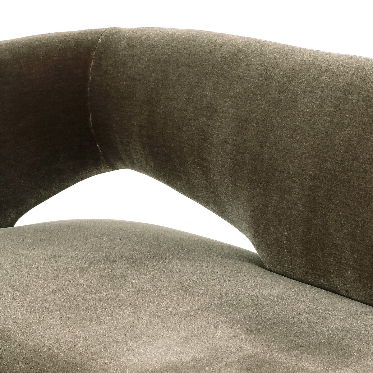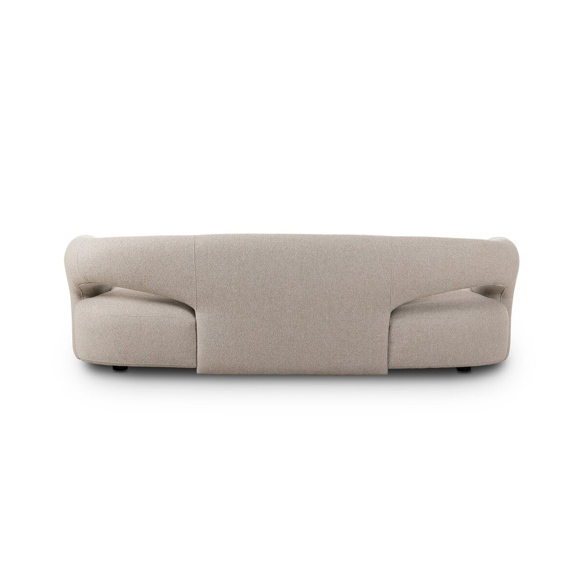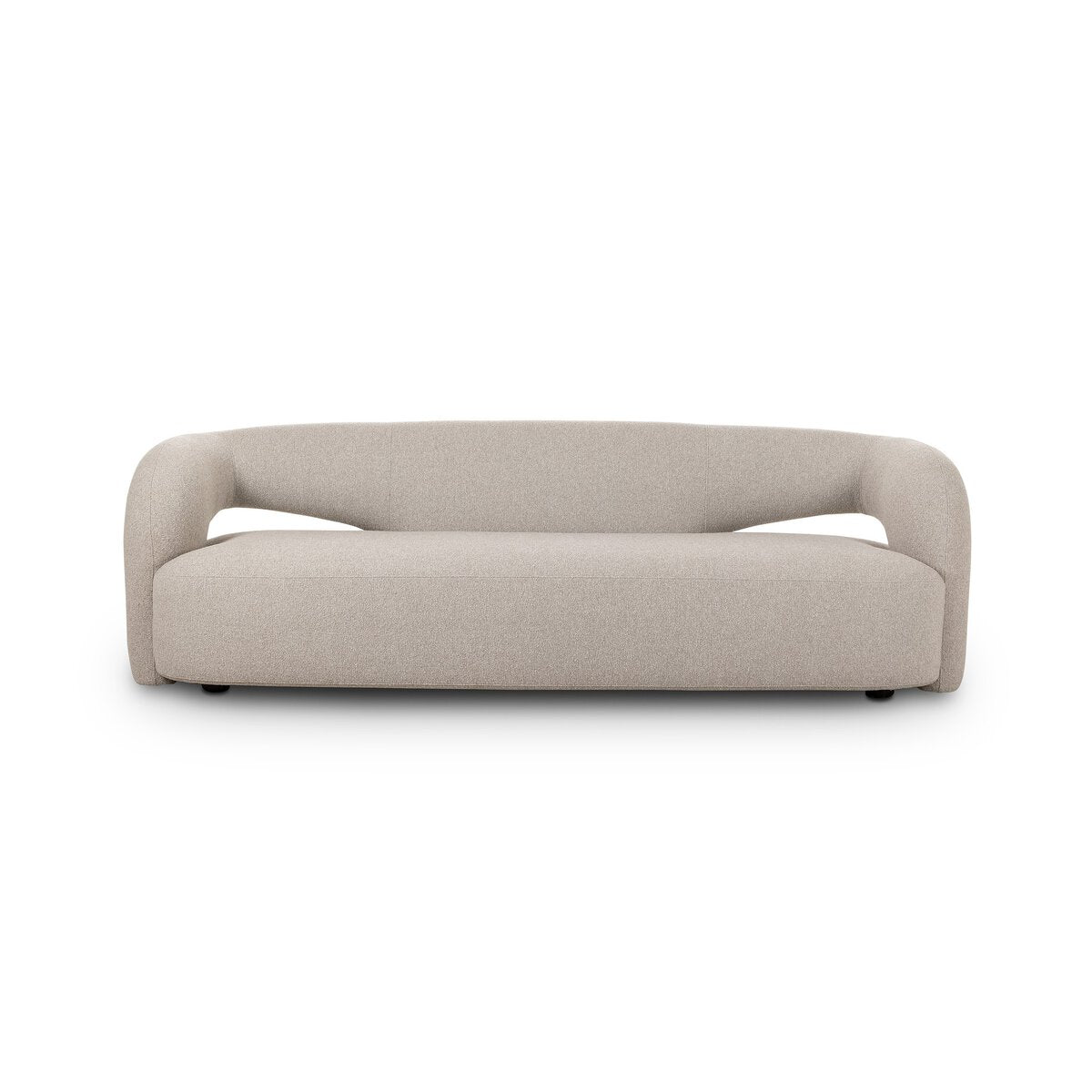 A fluid play on seating. This statement making sofa features subtle cutouts on the back with plush arms that hug the bench seat. Upholstered in a tight, wool-like textile for a polished look.