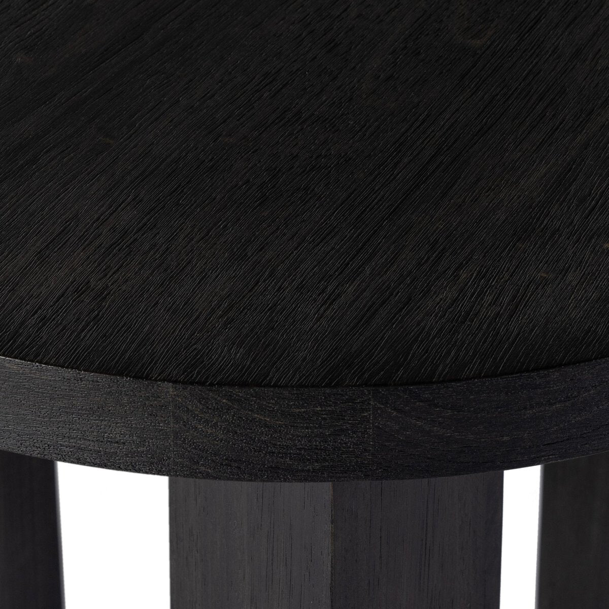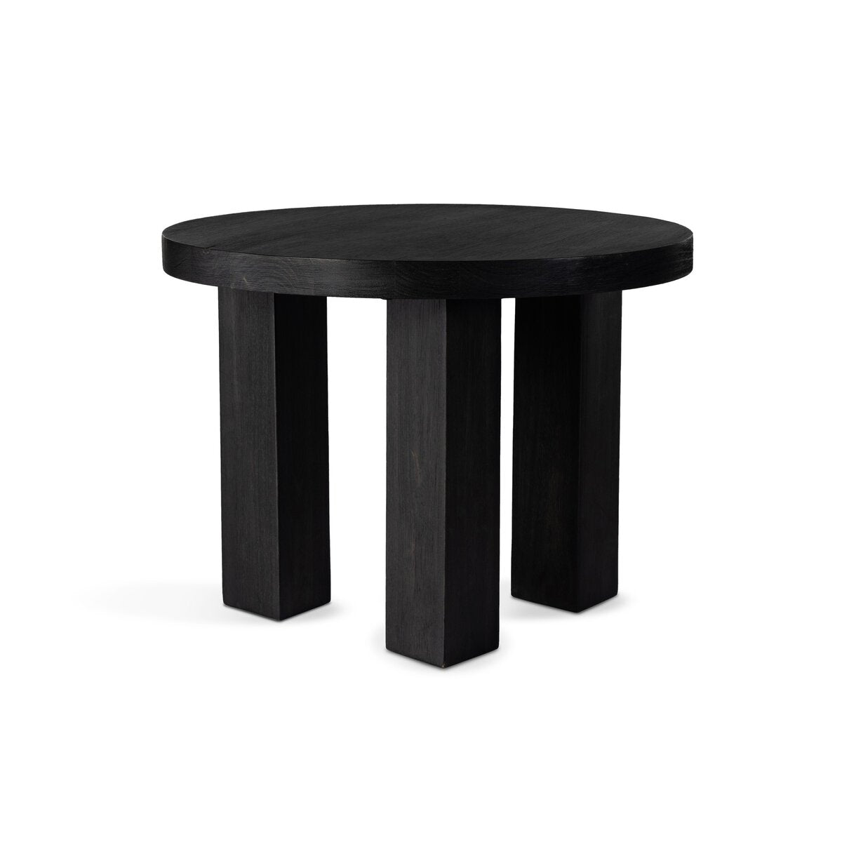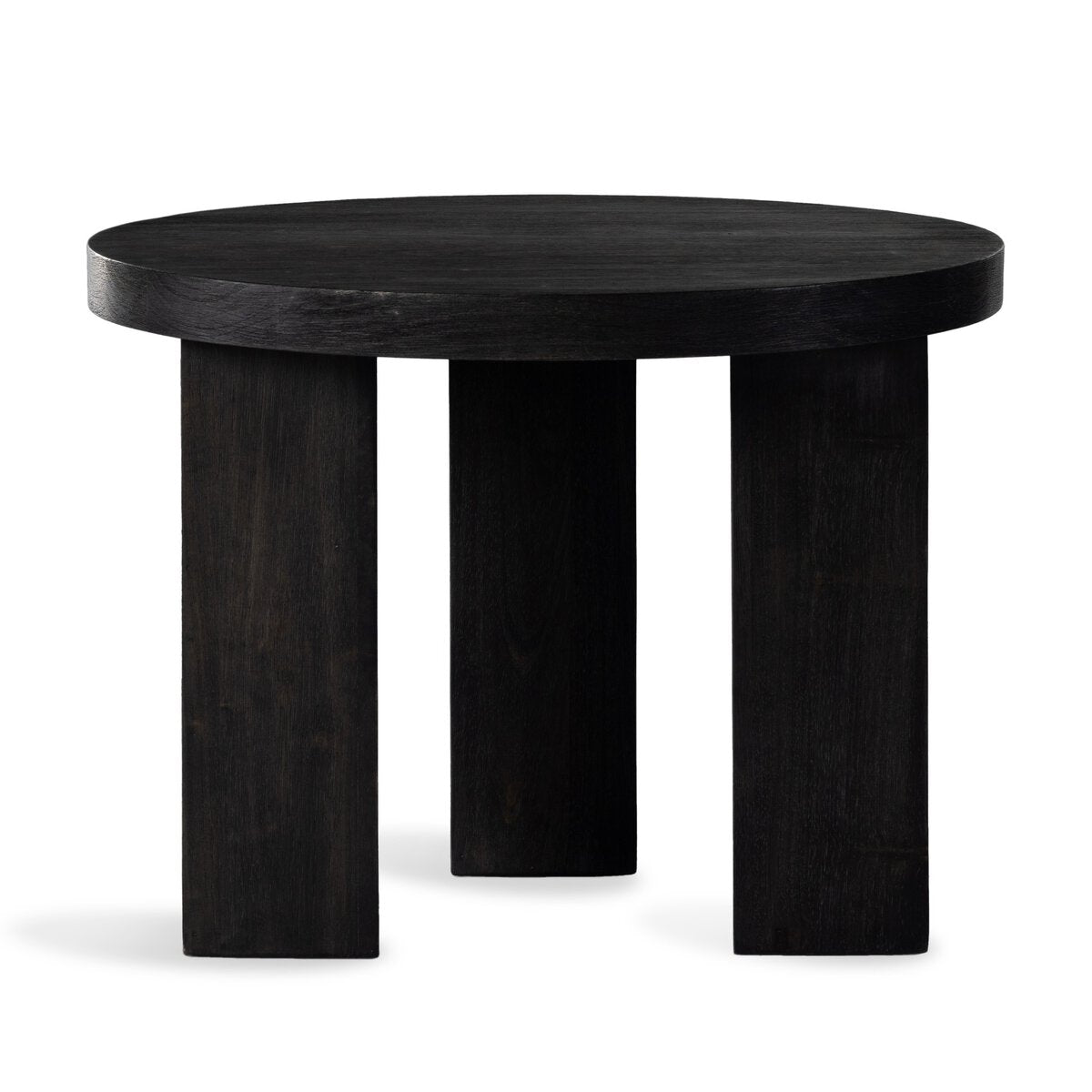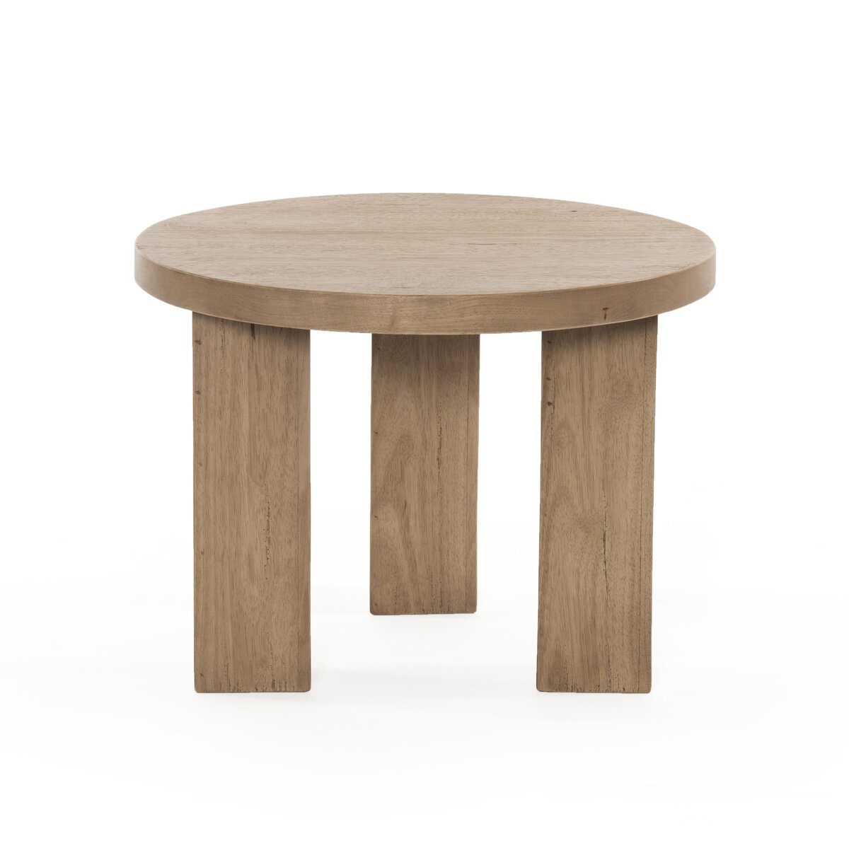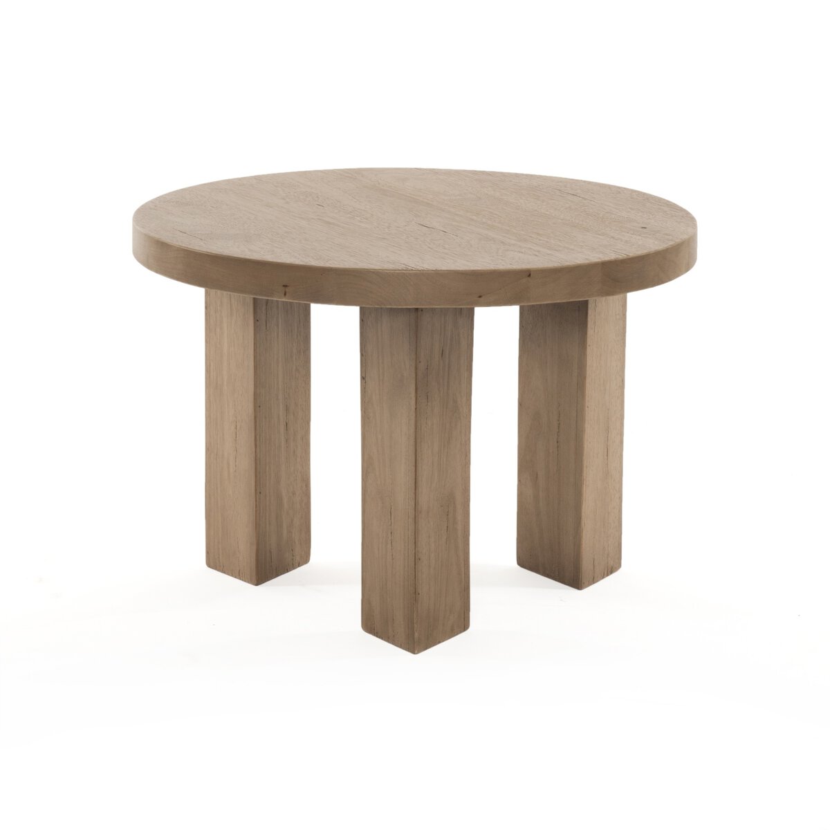 The perfect place to keep a drink or book within reach, light-brushed parawood forms a rounded tabletop, with thick, triangular pedestal legs inspired by modern European design.