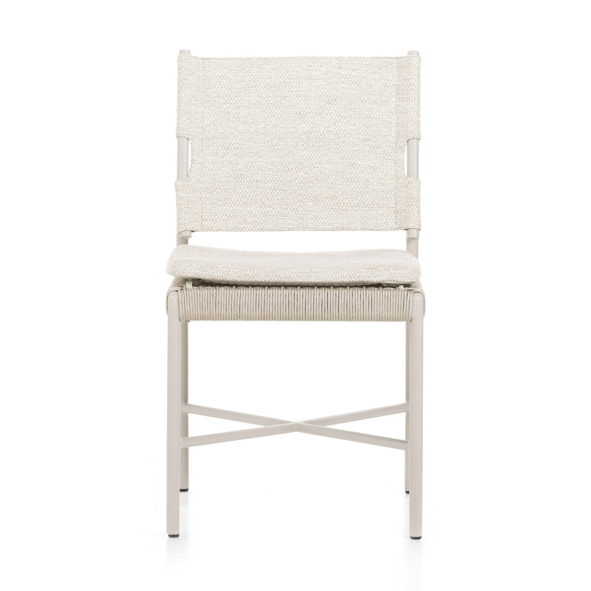Make a beautifully monochromatic statement, indoors or out. Finished in a light taupe, slim, airy aluminum frames all-weather wicker seating with a top cushion for added comfort. Cover or store indoors during inclement weather and when not in use. Our Weatherproof Outdoor Dining Chair Cover in size small fits this chair.