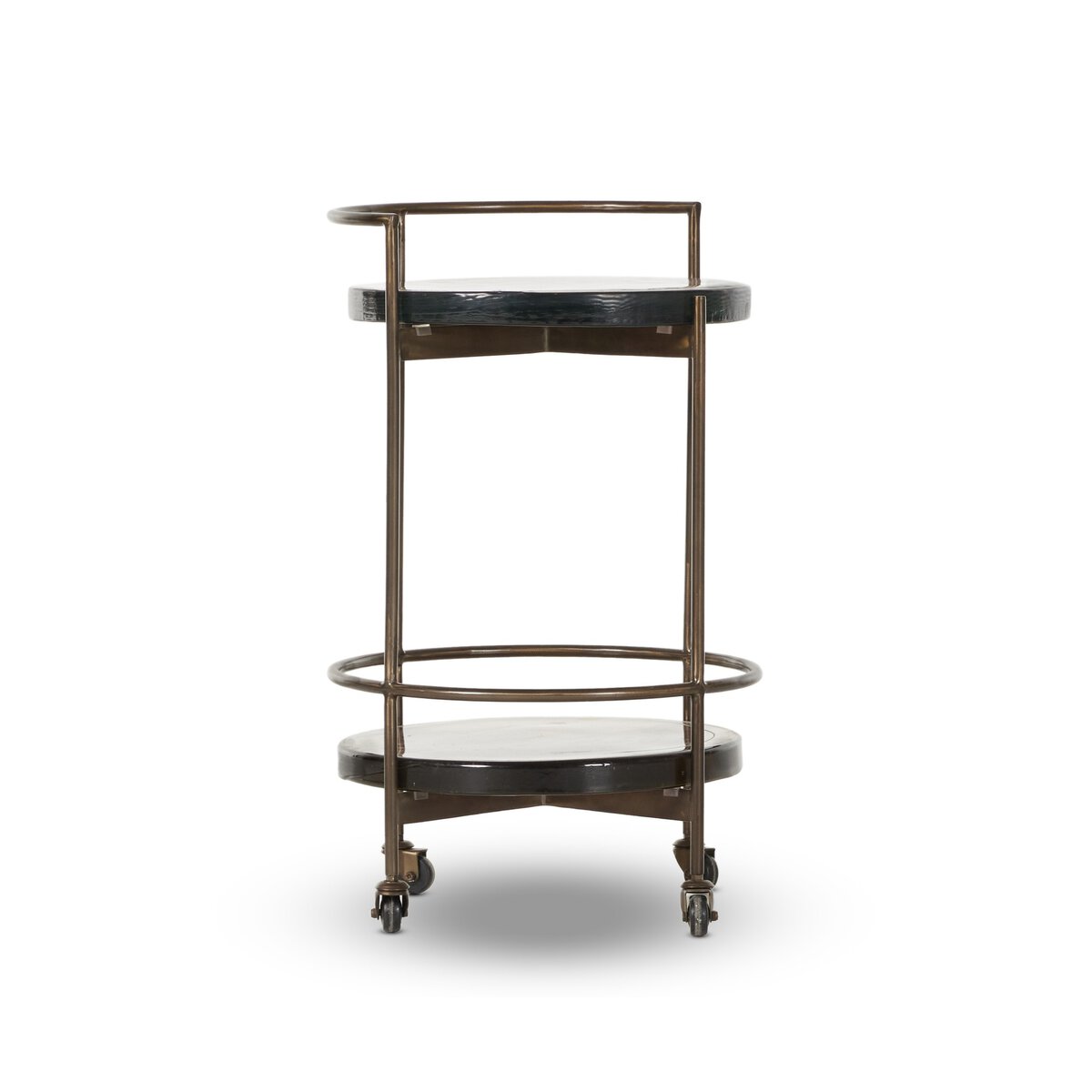 Thick cast glass in a dark brown hue pairs with a structured dark brass frame to form this round bar cart.