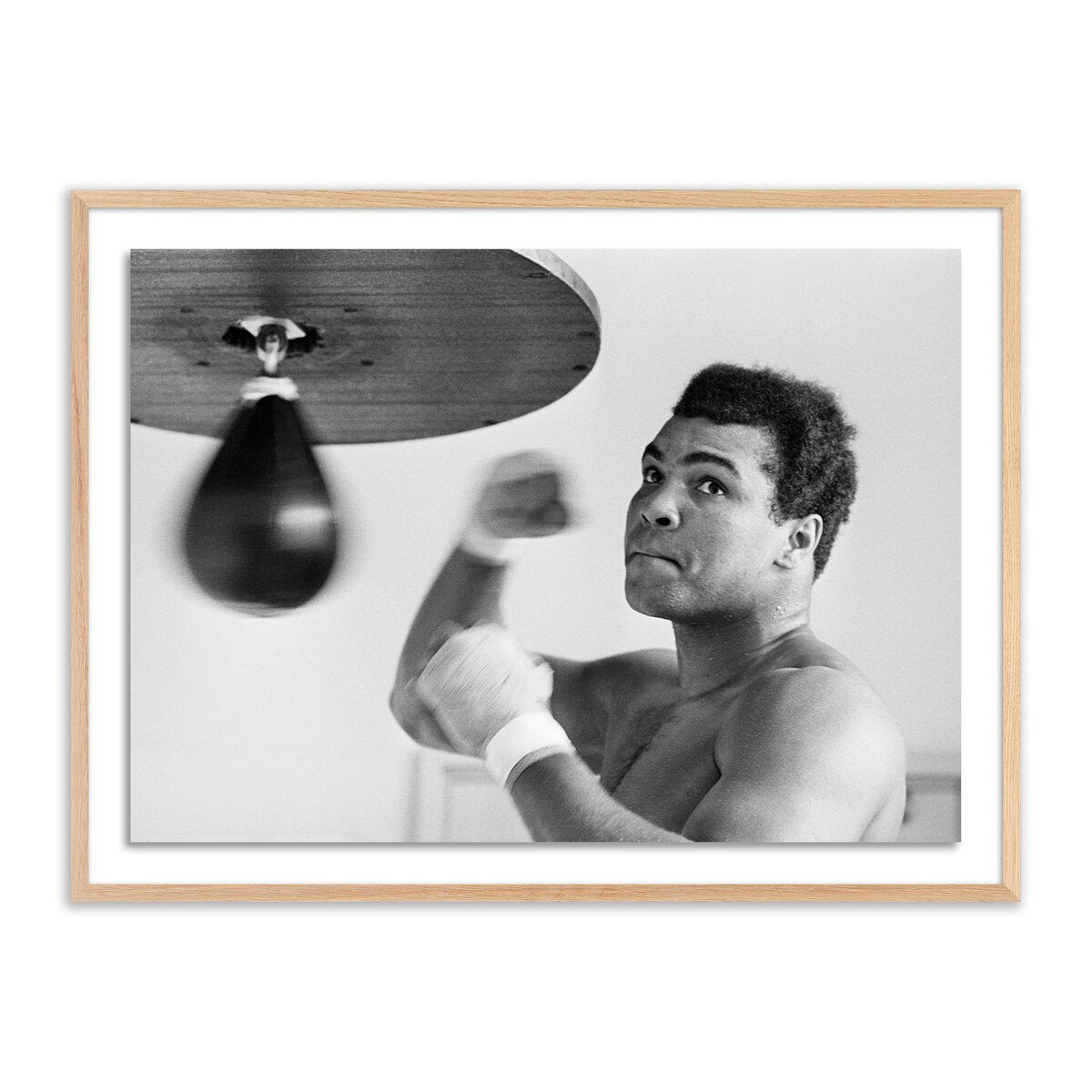 Muhammad Ali gets a few practice punches in. Courtesy of Getty Images. Printed on premium photo paper and float-mounted within a 100% American maple frame. Handmade in Austin, Texas, each print includes a certificate of authenticity commemorating the exclusive partnership between Getty Images and Four Hands Art Studio.