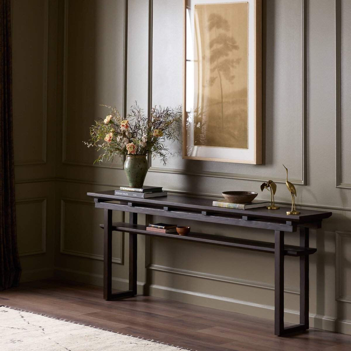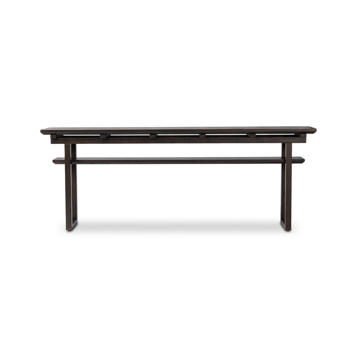Overall Dimensions 80.00"w x 13.00"d x 30.00"hItem Number 249149-003Colors Cocoa Oak VeneerMaterials Oak Veneer, Solid OakWeight 77.16 lbVolume 9.01 cu ftClearance from Floor 1 19.45"Distance between Legs (Side to Side) 1 62.95"Fixed Shelf Depth 1 7.99"Fixed Shelf Height 1 1.26"Fixed Shelf Width 1 74.41"Interior Section Depth 1 7.99"Interior Section Height 1 5.00"Interior Section Width 1 74.41"Leg/Base Depth 1 11.46"Leg/Base Height 1 25.71"Leg/Base Width 1 1.77"Overhang Width 1 6.73"Tabletop Thickness 1.50"Anti-Tip Kit Included? YesDoor Type No DoorsDrawer Glide Type NoneDrawer Stop Material NoneFixed Shelf Qty 1.00Fixed Shelves YesFrame Construction Joinery Edge Banded VeneerFrame Construction Joinery Mortise and TenonFrame Construction Joinery Pocket Joint with ScrewsFunctionality ShelvesHas Leveler YesInterior Section Quantity 1.00Protective Feet Leg LevelersShape Type RectangleSuite NaiyaWeight Capacity 200 lb