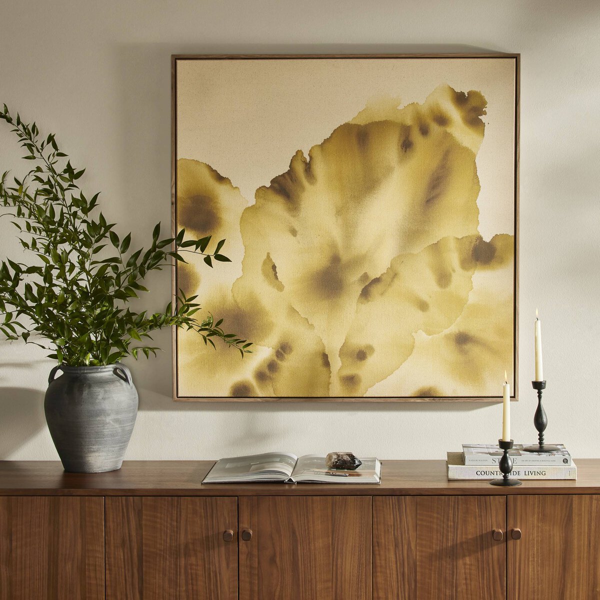 Overall Dimensions 40.00"w x 2.00"d x 40.00"hItem Number 240220-001Colors Rustic Walnut Floater, Fredrix 558 Raw CanvasMaterials Rustic Walnut, Raw CanvasWeight 20.00 lbVolume 4.70 cu ftArtist Molly FrankenMain Color YellowOrientation SquarePresentation Style Canvas Floater FramedSize LargeSubject AbstractSuite Natural Order
