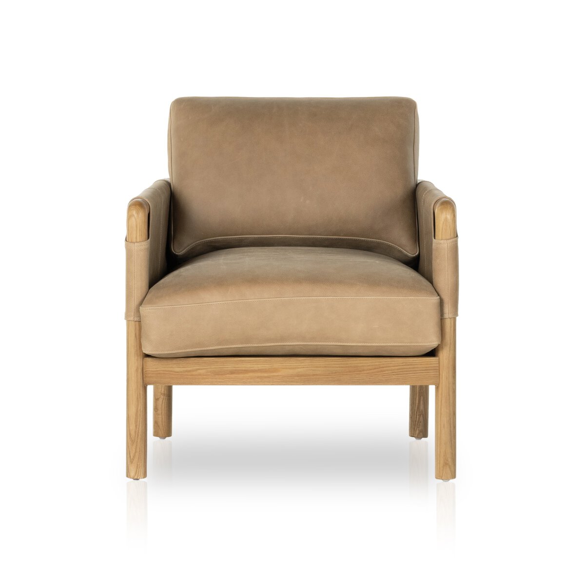 Safari inspiration meets zen aspirations. A cylindrical frame is crafted, smoothed and rounded from solid ash wood. Includes two loose feather-blend cushions covered in subtly distressed thick cut leather in a neutral taupe hue for a monochromatic look.