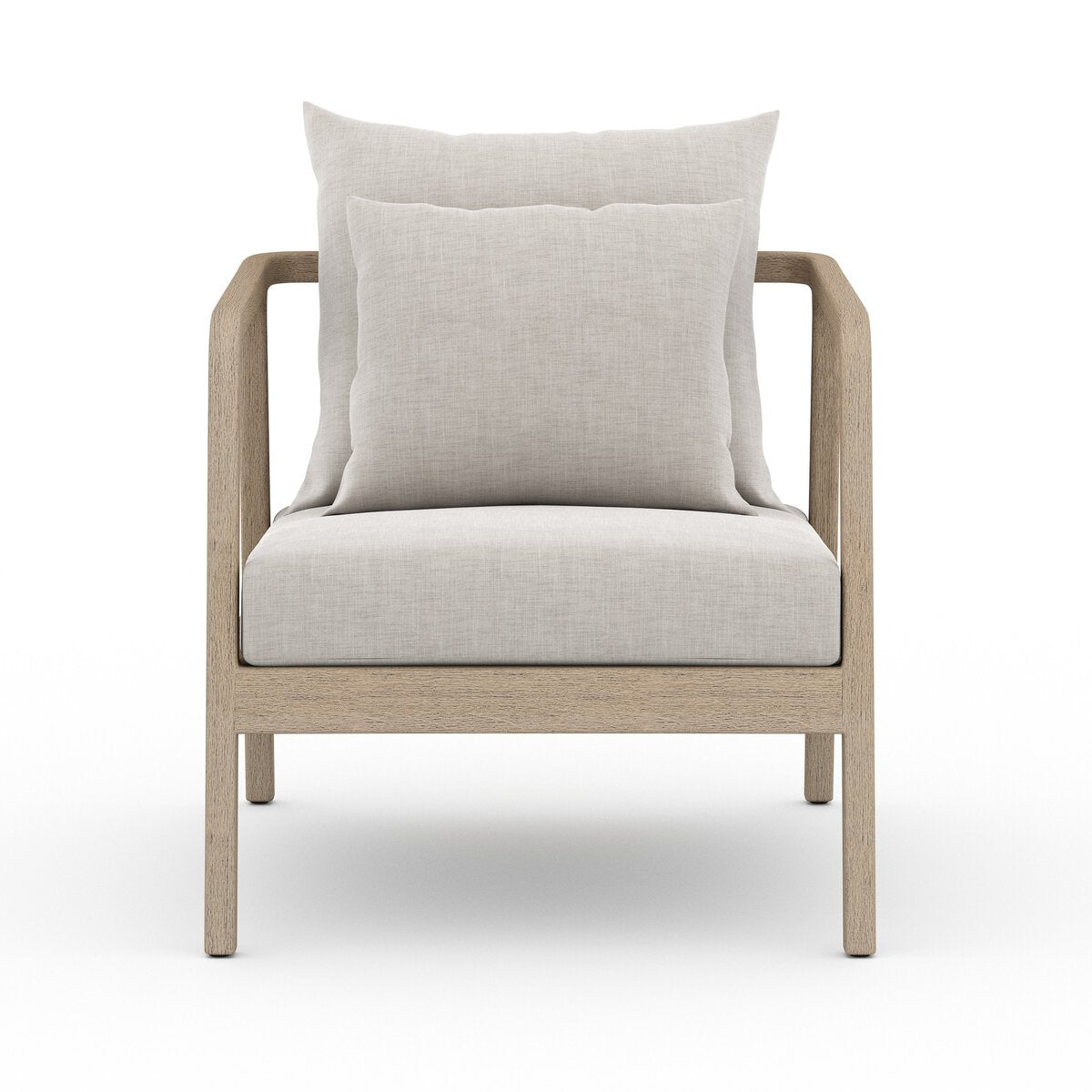 Gently shaped teak creates a light and airy frame that contrasts perfectly with plush cushioning and thick woven rope detailing. Solid FSC-certifed teak frame with UV-resistant, water-repellent fabric on all cushions. Cover or store indoors and when not in use.