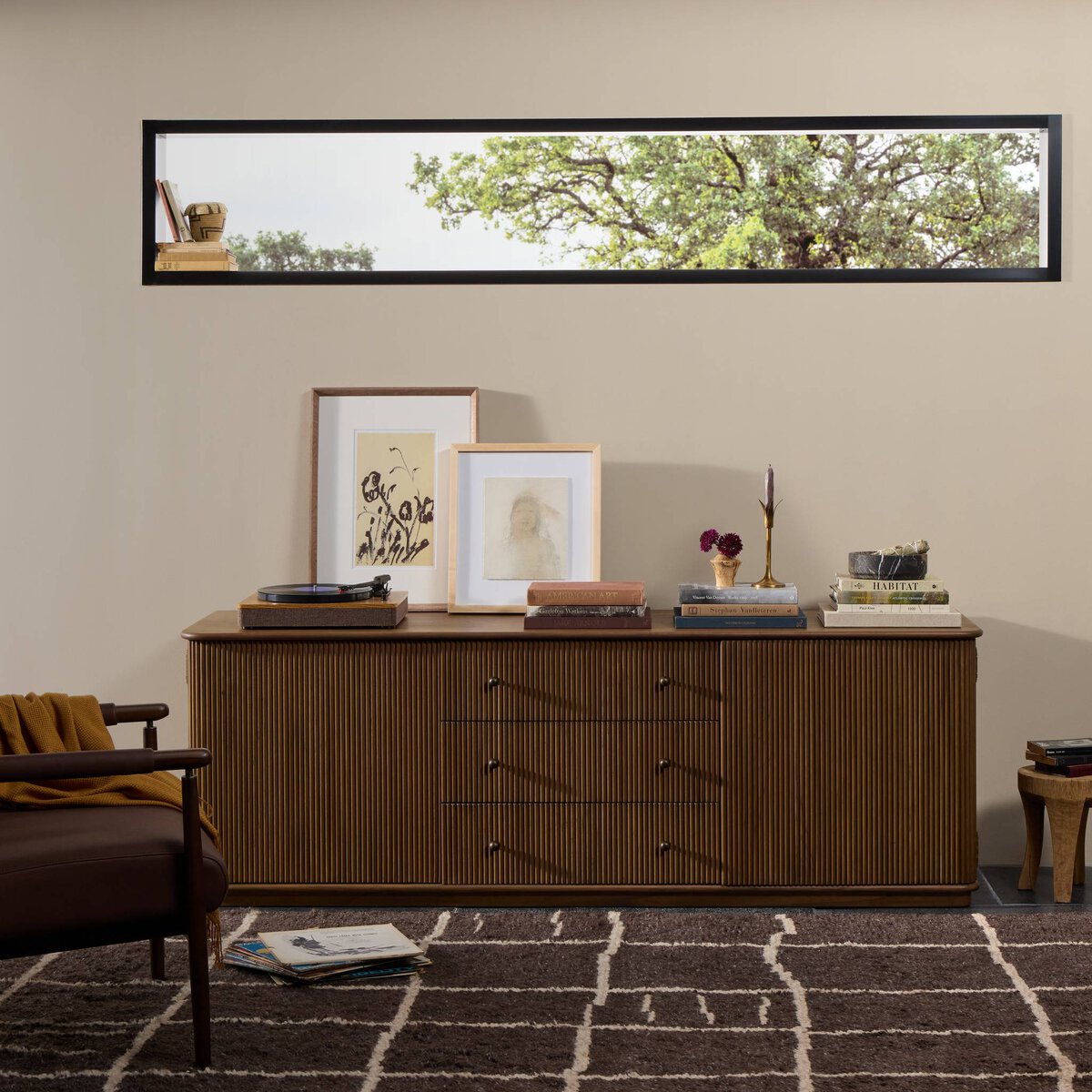 Overall Dimensions 80.50"w x 20.75"d x 27.50"hItem Number 252485-002Colors Amber Mindi, Amber Mindi VeneerMaterials Solid Mindi, Mindi VeneerWeight 192.90 lbVolume 41.14 cu ftClearance from Floor 1 1.57"Distance between Pin Placements 2.48"Door Height 1 24.45"Door Thickness 1 0.75"Door Width 1 25.55"Drawer Depth 1 14.76"Drawer Height 1 5.55"Drawer Opening Depth 11.10"Drawer Width 1 25.43"Interior Section Depth 1 18.76"Interior Section Depth 2 18.76"Interior Section Height 1 24.45"Interior Section Height 2 24.45"Interior Section Width 1 24.35"Interior Section Width 2 24.35"Removable Shelf (Fixed or Adjustable) Depth 1 15.75"Removable Shelf (Fixed or Adjustable) Height 1 0.75"Removable Shelf (Fixed or Adjustable) Width 1 24.35"