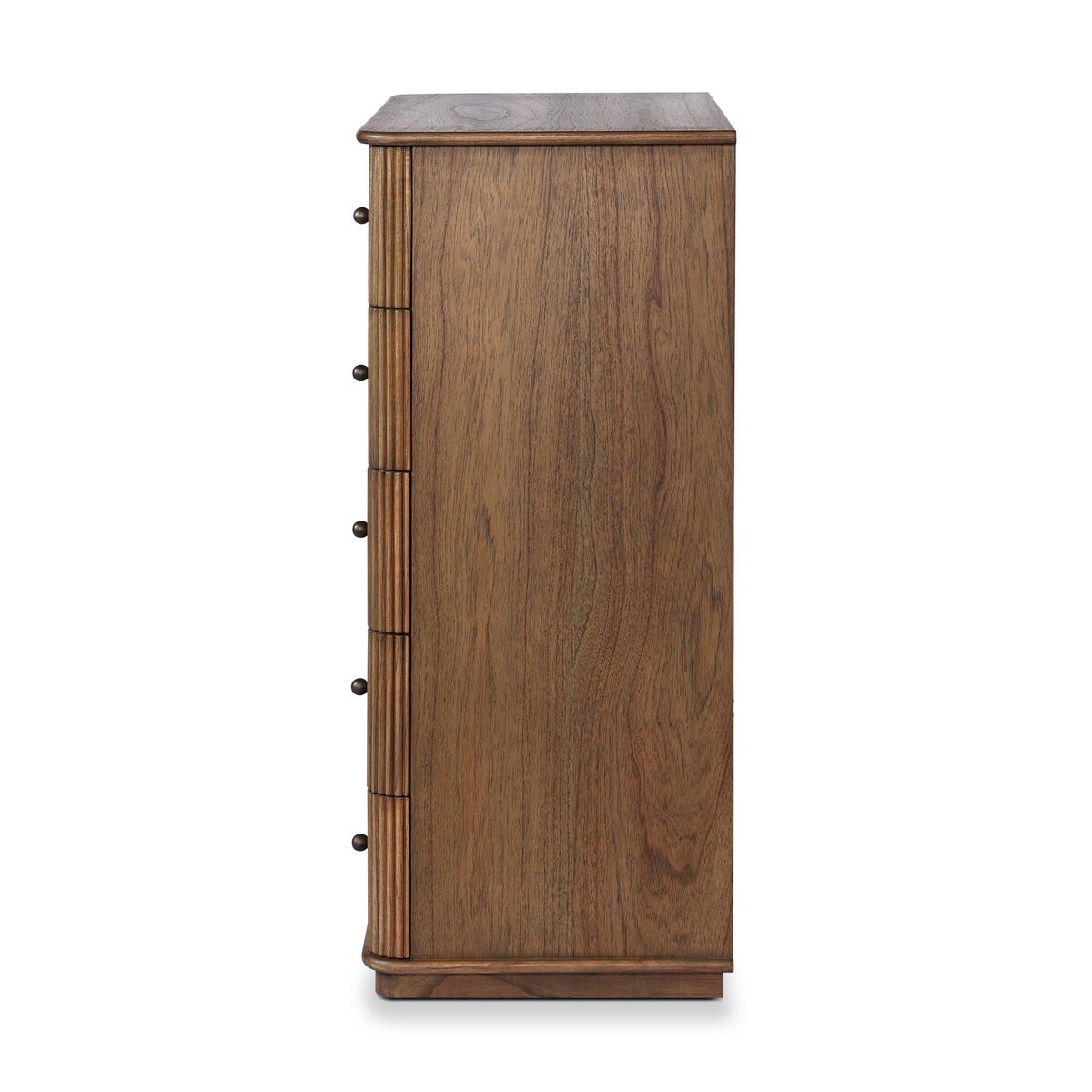 Overall Dimensions 39.25"w x 20.75"d x 48.25"hItem Number 251481-003Colors Amber Mindi, Amber Mindi VeneerMaterials Solid Mindi, Mindi VeneerWeight 206.13 lbVolume 34.36 cu ftClearance from Floor 1 1.57"Drawer Depth 1 15.94"Drawer Height 1 6.34"Drawer Opening Depth 11.97"Drawer Width 1 33.27"Anti-Tip Kit Included? YesDoor Type No DoorsDrawer Glide Color SilverDrawer Glide Type Undermount MetalDrawer Joinery English DovetailDrawer Quantity 5.00Drawer Stop Material NoneFrame Construction Joinery Bore and DowelFrame Construction Joinery Edge Banded VeneerFrame Construction Joinery Tongue and GrooveFunctionality DrawersHas Soft Close Drawers YesProtective Feet Leg LevelersShape Type TallSuite OnaWeight Capacity 100 lb