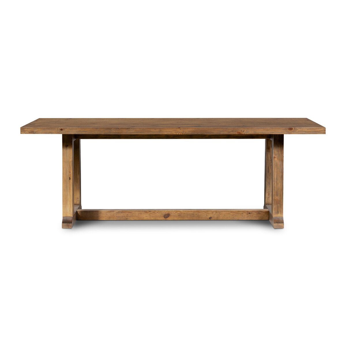 Overall Dimensions 86.50"w x 39.25"d x 30.00"hItem Number 100391-003Colors Waxed Pine, Honey PineMaterials Solid PineWeight 157.63 lbVolume 19.18 cu ftApron Height 2.99"Clearance from Floor 1 27.91"Distance between Legs (Side to Side) 1 58.58"Leg/Base Depth 1 31.34"Leg/Base Height 1 27.91"Leg/Base Width 1 64.57"Opening for Seating Height 27.91"Overhang Width 1 11.02"Tabletop Thickness 2.01"Weight Capacity 200 lb