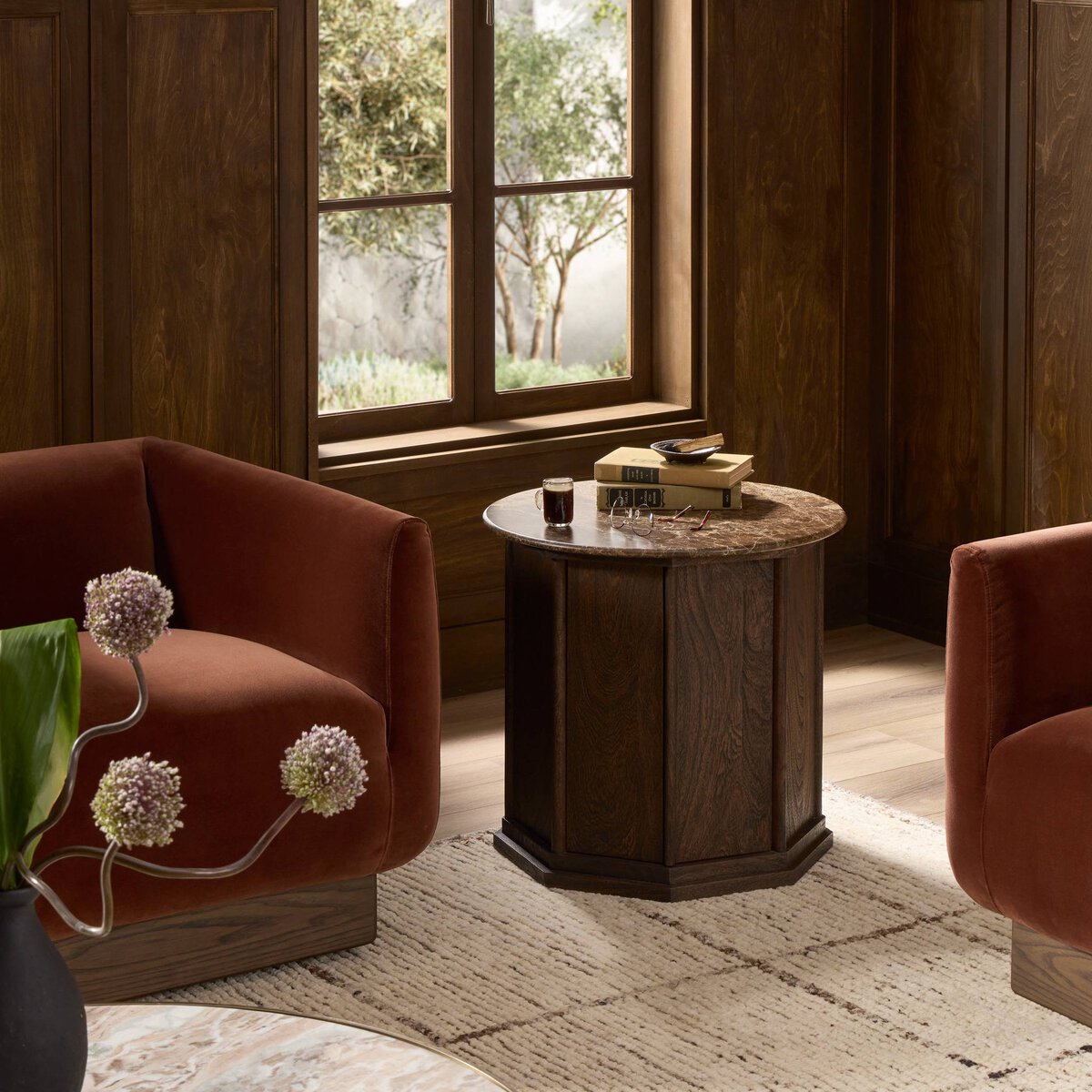 Overall Dimensions 23.00"w x 23.00"d x 22.00"hItem Number 250474-002Colors Brown Marble, Dark Brown AcaciaMaterials Solid Marble, Solid AcaciaWeight 75.84 lbVolume 12.71 cu ftClearance from Floor 1 21.38"Fixed Shelf Depth 1 15.75"Fixed Shelf Height 1 0.63"Fixed Shelf Width 1 15.75"Interior Section Depth 1 15.75"Interior Section Depth 2 15.75"Interior Section Height 1 9.13"Interior Section Height 2 9.13"Interior Section Width 1 15.75"Interior Section Width 2 15.75"Leg/Base Depth 1 20.00"Leg/Base Height 1 21.38"Leg/Base Width 1 20.00"Overhang Width 1 1.50"Tabletop Thickness 0.63"Drawer Glide Type NoneDrawer Stop Material NoneFixed Shelf Qty 1.00Fixed Shelves YesFrame Construction Joinery Miter JointFunctionality DoorsFunctionality ShelvesHas Leveler YesInterior Section Quantity 2.00Protective Feet Leg LevelersShape Type RoundSuite PavloWeight Capacity 100 lb