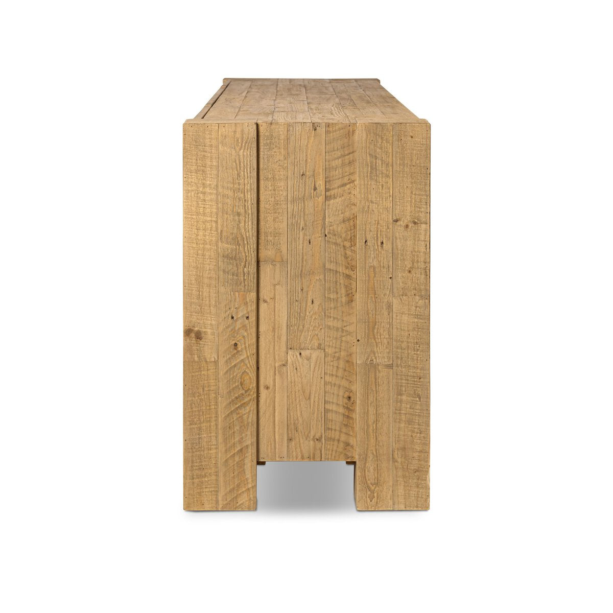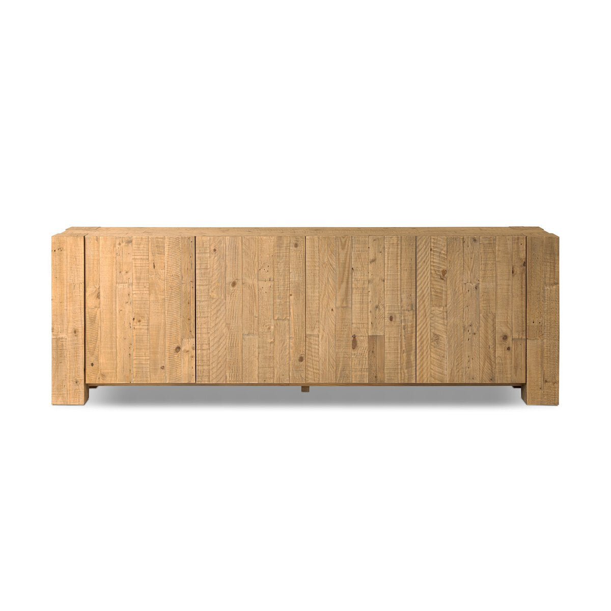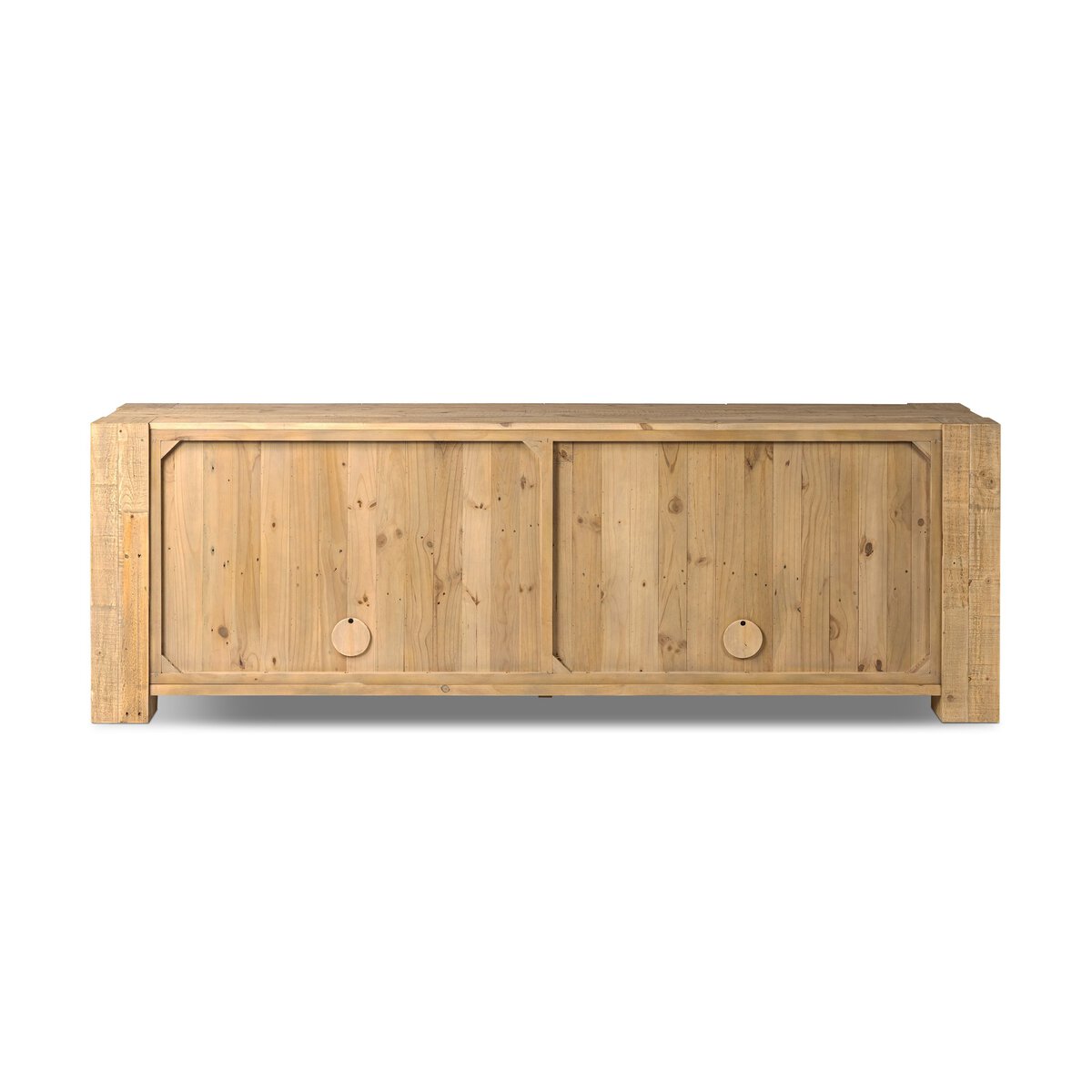 Overall Dimensions 94.00"w x 20.00"d x 32.00"hItem Number 245832-002Colors Light Blonde PineMaterials Solid Reclaimed PineWeight 191.80 lbVolume 57.81 cu ftClearance from Floor 1 2.80"Distance between Pin Placements 1.97"Door Height 1 27.95"Door Thickness 1 0.71"Door Width 1 20.37"Interior Section Depth 1 14.96"Interior Section Depth 2 14.96"Interior Section Height 1 26.73"Interior Section Height 2 26.73"Interior Section Width 1 39.72"Interior Section Width 2 39.72"Removable Shelf (Fixed or Adjustable) Depth 1 14.96"Removable Shelf (Fixed or Adjustable) Height 1 0.71"Removable Shelf (Fixed or Adjustable) Width 1 39.72"Door Closure Catch Type Push LatchDoor Qty 4.00Door Type HingedDrawer Glide Type NoneDrawer Stop Material NoneFrame Construction Joinery Edge Banded VeneerFrame Construction Joinery Frame and Panel ConstructionFunctionality DoorsFunctionality ShelvesHinge Type Cabinetry-soft closeInterior Section Quantity 2.00Protective Feet Leg LevelersRecommended Shelf Capacity (kg) 18.14Recommended Shelf Capacity (lbs) 40.00Removable Shelf YesRemovable Shelf Adjustable? YesRemovable Shelf Qty 2.00Suite PerotWeight Capacity 200 lb