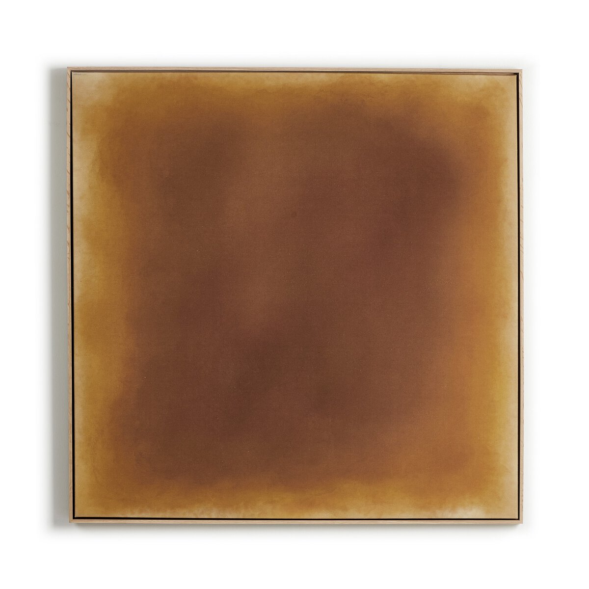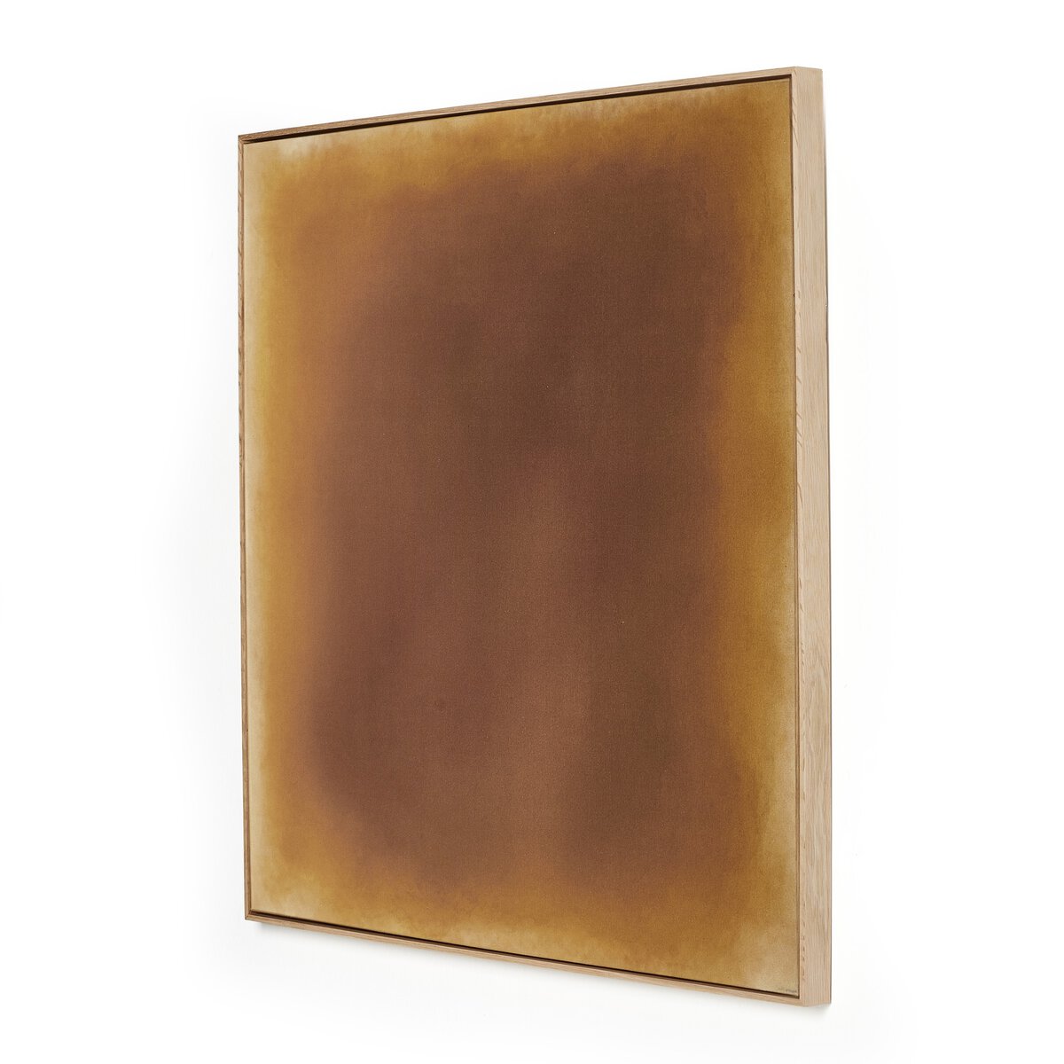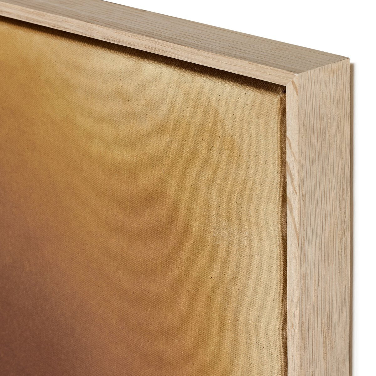 Layered watercolors and inks offer a delicate take on color blocking. Printed on raw canvas within rustic walnut. Handmade in Austin, Texas.
