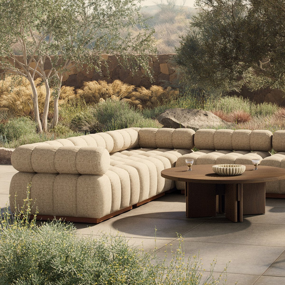 Overall Dimensions 109.50"w x 109.50"d x 27.50"hItem Number 230028-006Colors Hayes Cream, Stained Toasted BrownMaterials 100% Olefin, Solid TeakWeight 270.62 lbVolume 53.68 cu ftCleaning Code