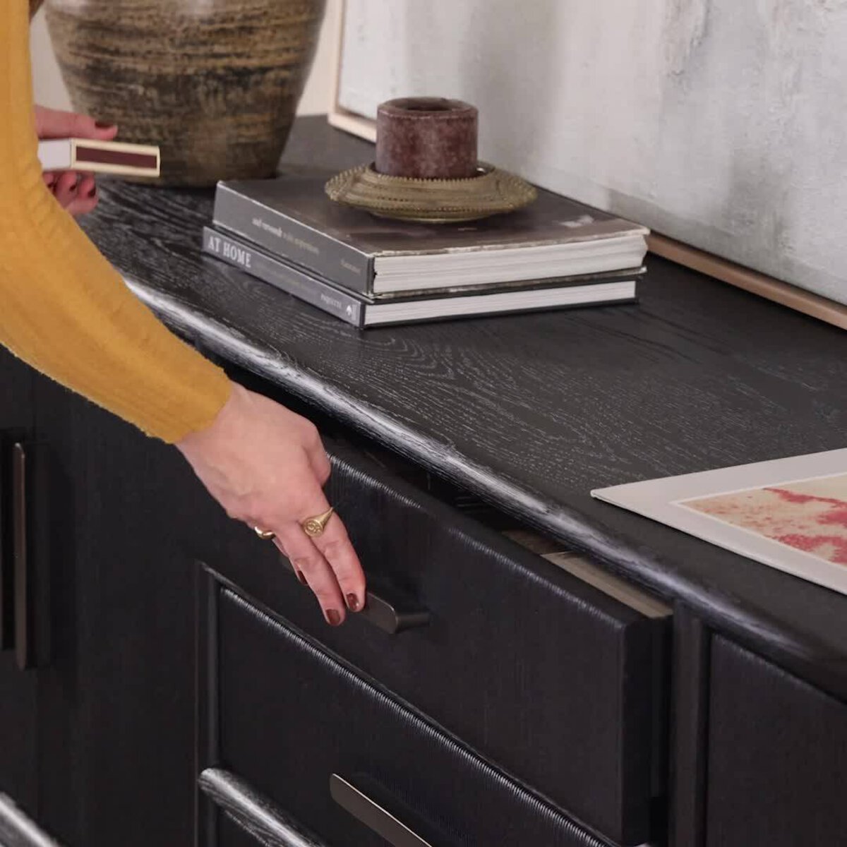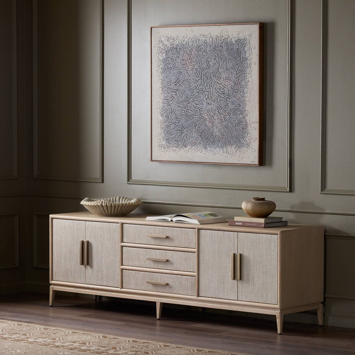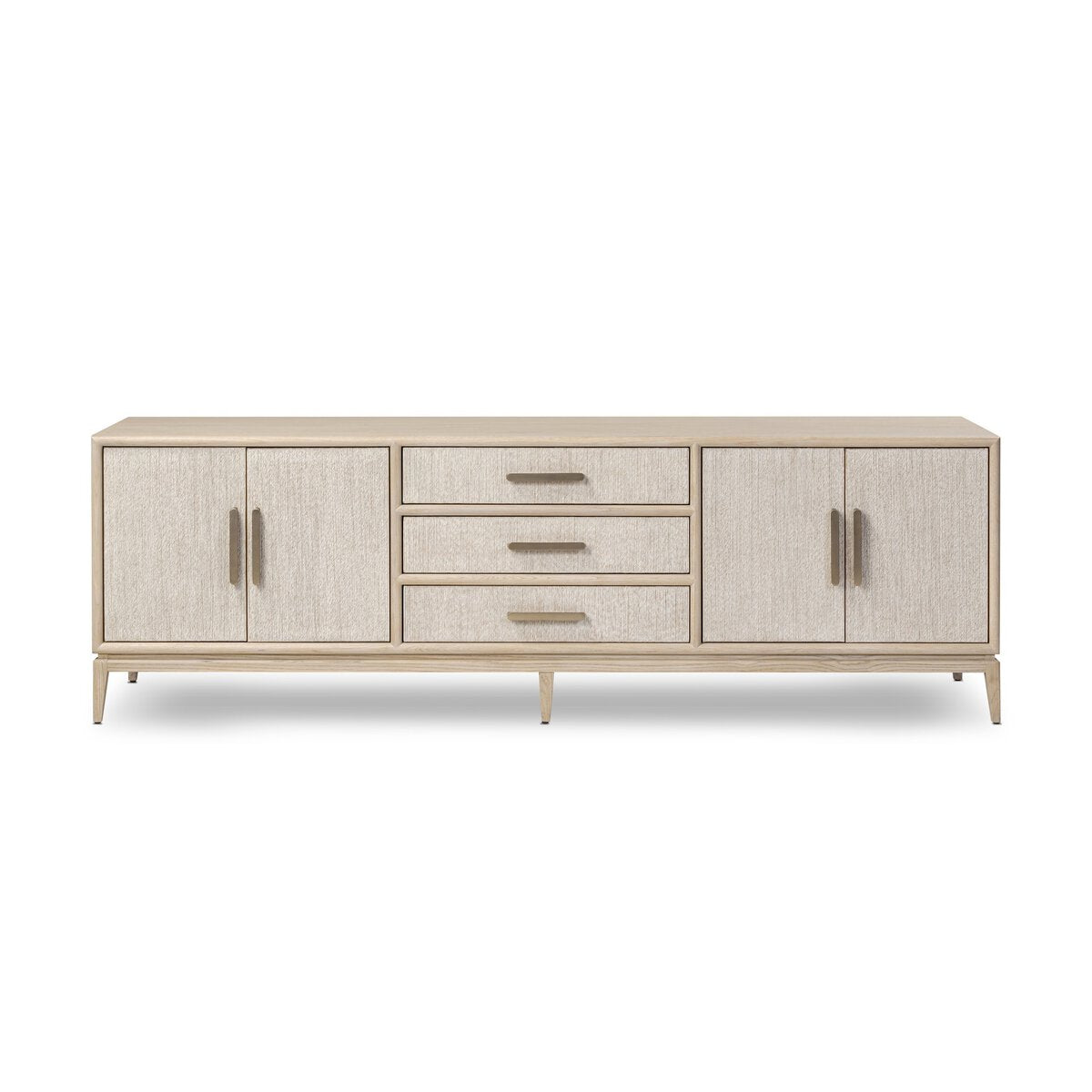 Overall Dimensions 84.00"w x 20.00"d x 27.25"hItem Number 249535-002Colors Natural Paper Cord, Natural Oak Veneer, Natural Oak SolidMaterials Rush, Oak Veneer, Solid OakWeight 230.16 lbVolume 46.69 cu ftClearance from Floor 1 5.00"Distance between Pin Placements 2.52"Door Height 1 0.83"Door Thickness 1 18.35"Door Width 1 13.19"Drawer Depth 1 14.80"Drawer Height 1 3.11"Drawer Width 1 24.92"Interior Section Depth 1 17.44"Interior Section Depth 2 17.44"Interior Section Height 1 18.50"Interior Section Width 1 26.42"Interior Section Width 2 26.42"Removable Shelf (Fixed or Adjustable) Depth 1 17.44"Removable Shelf (Fixed or Adjustable) Height 1 1.18"Removable Shelf (Fixed or Adjustable) Width 1 26.42"Anti-Tip Kit Included? YesCord Management YesDoor Qty 4.00Door Type HingedDrawer Glide Color SilverDrawer Glide Type Undermount MetalDrawer Joinery English DovetailDrawer Quantity 3.00Drawer Stop Material NoneFrame Construction Joinery Butt JointFunctionality DoorsHas Leveler YesHas Soft Close Drawers YesHinge Type Cabinetry-soft closeInterior Section Quantity 2.00Protective Feet Leg LevelersRecommended Shelf Capacity (kg) 18.14Recommended Shelf Capacity (lbs) 40.00Removable Shelf YesRemovable Shelf Adjustable? YesRemovable Shelf Qty 2.00Suite Rosenell