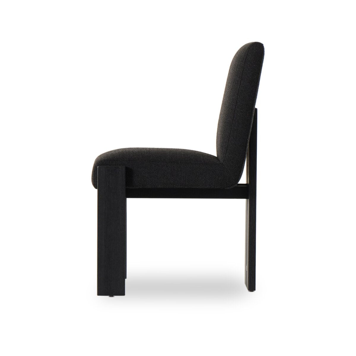 Unique in shape with a dark, monochromatic look. Smoked grey parawood forms an angular frame, featuring butterfly joints between the back legs. High-performance fabric in ash is the smart choice for everyday dining. Performance fabrics are specially created to withstand spills, stains, high traffic and wear, ensuring long-term comfort and unmatched durability.