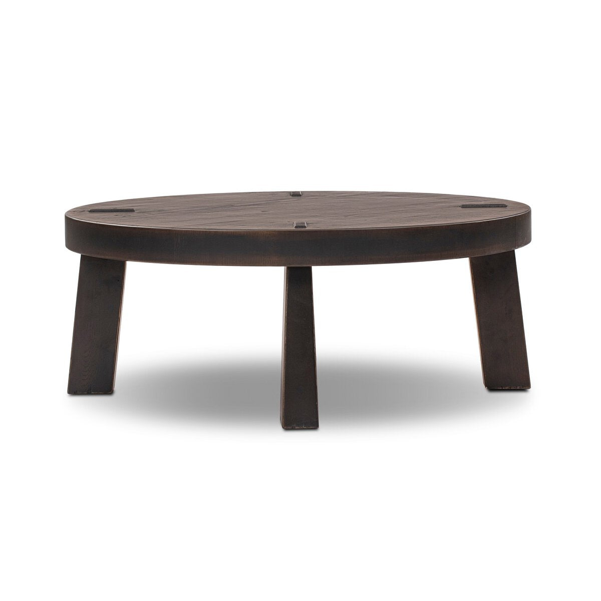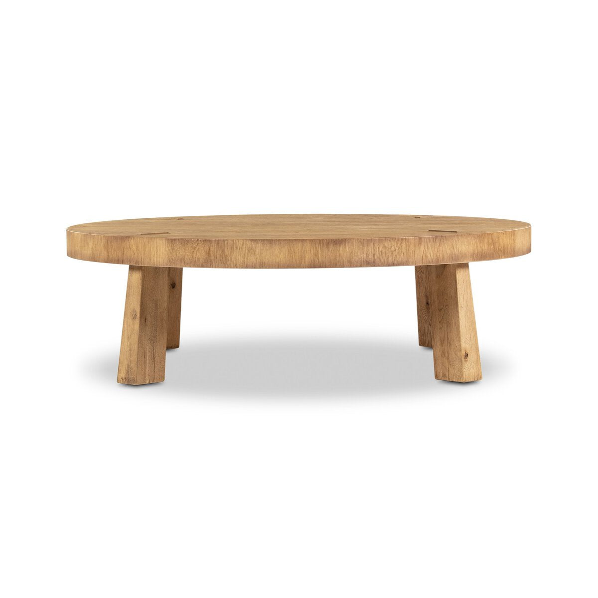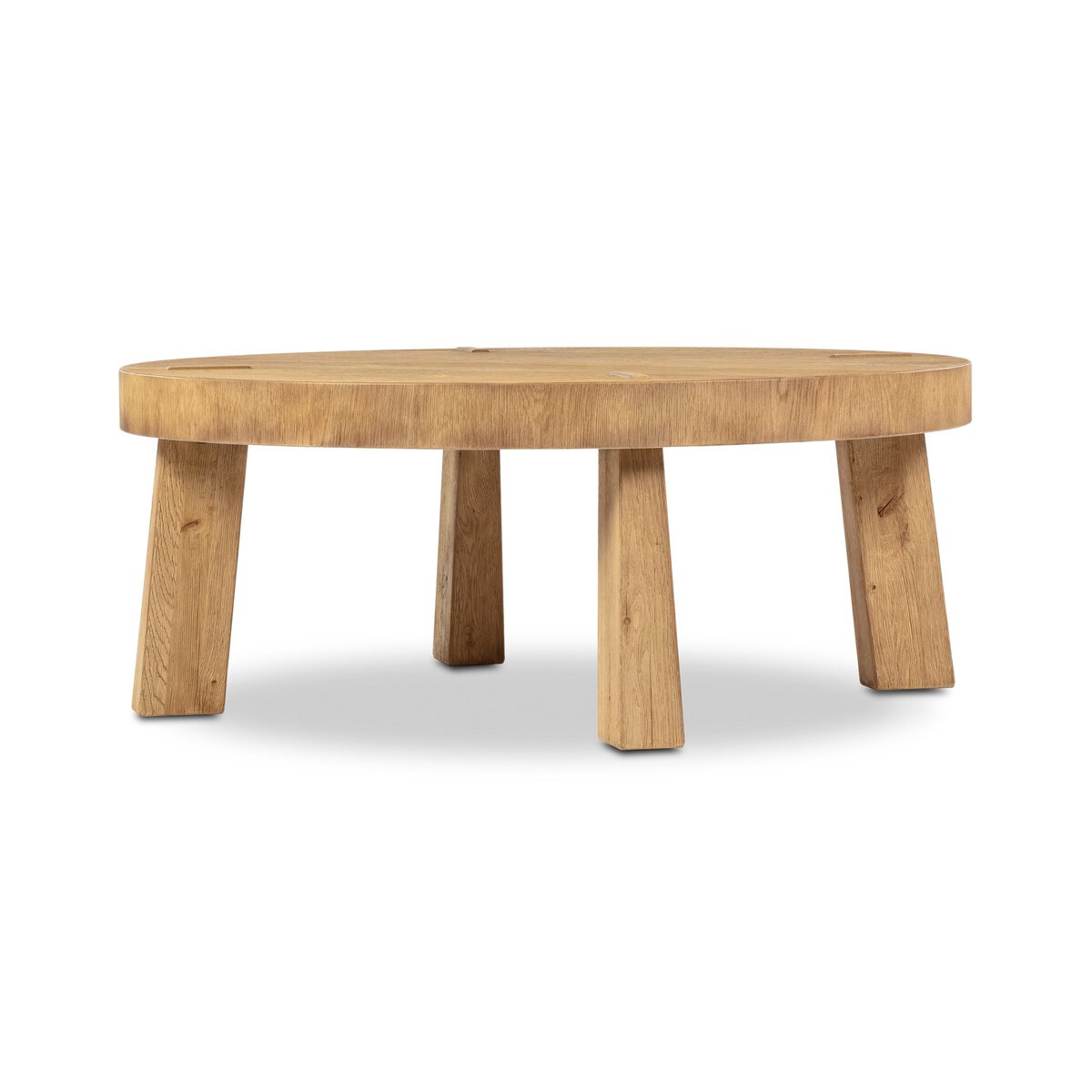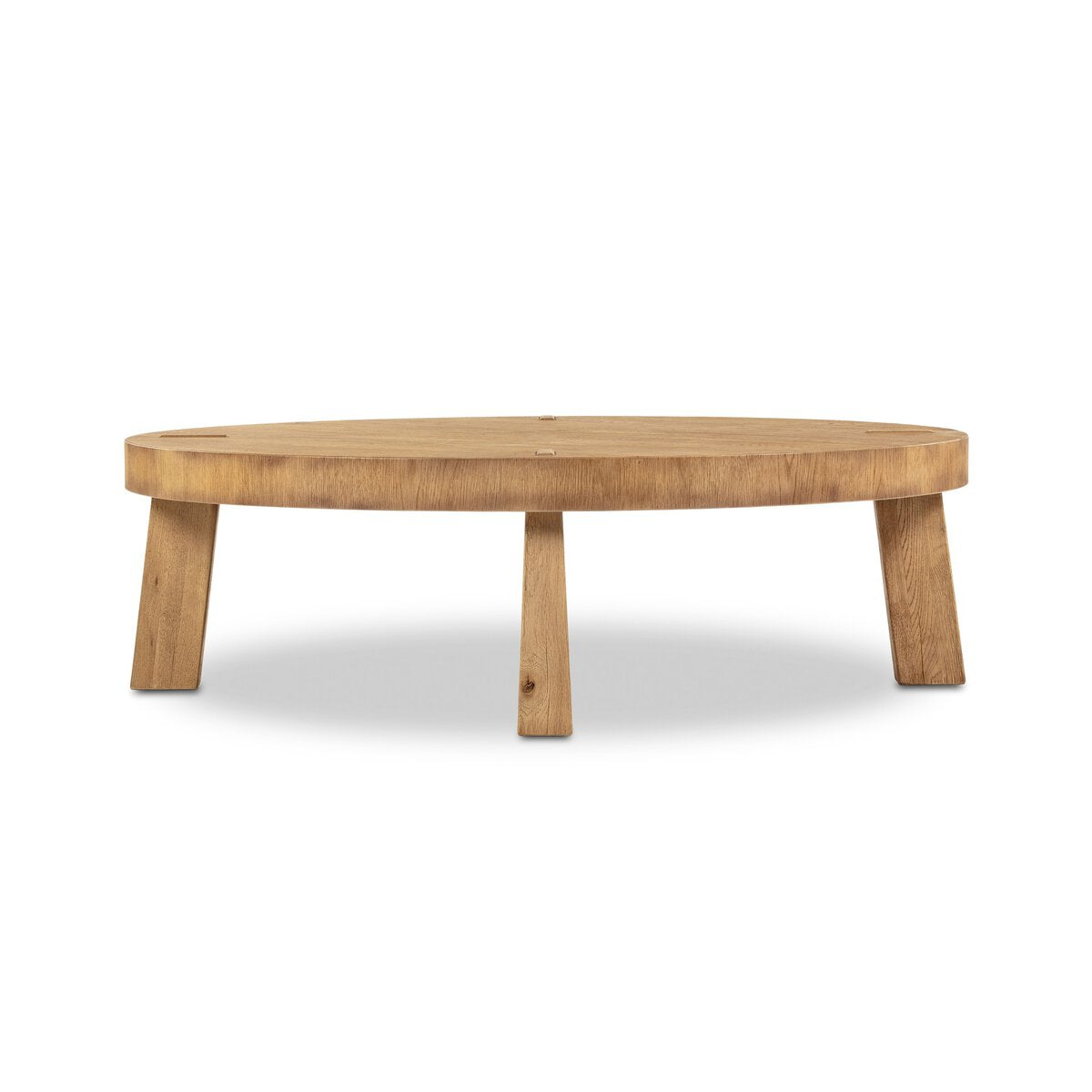 A rounded coffee table comes in a beautifully distressed, thick oak veneer inspired by Swedish folk — the perfect bold, antiqued living room centerpiece. Pull-through legs show exposed joinery for an authentic look. Perfectly sized for smaller spaces. A design collaboration by Amber Lewis and Four Hands. This item has limited online distribution and may not be sold on websites without prior approval. Visit the FAQ page in our Help Center for more details.
