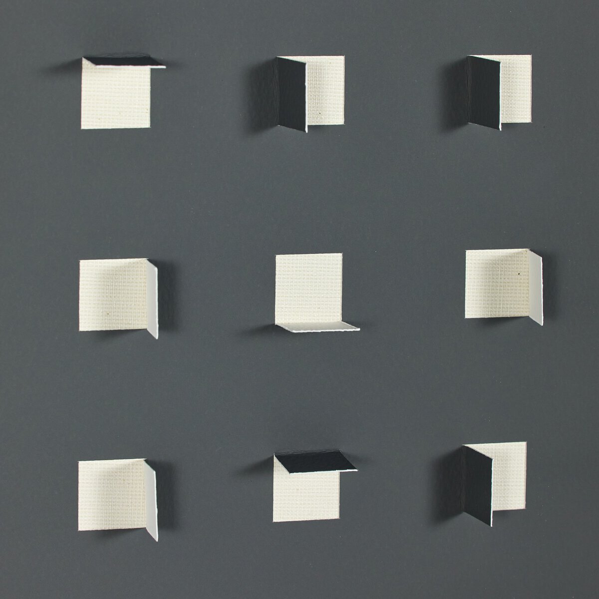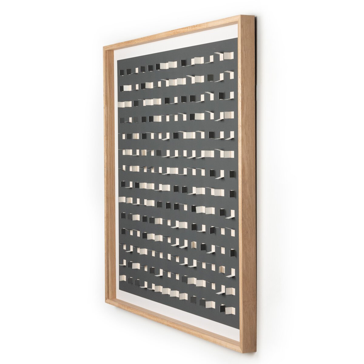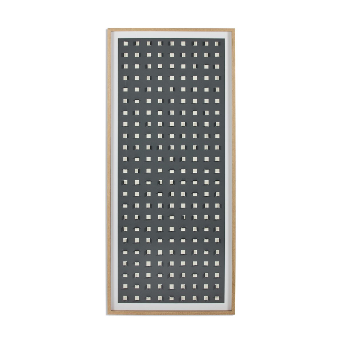 Dark slate blue paper cutouts atop a linen backer add layers of color and texture to any space. Framed in white oak for a gallery-quality look. If not currently in stock, this texture-enhanced piece ships within three weeks. Designed by Four Hands Art Studio and handmade in Austin, Texas.