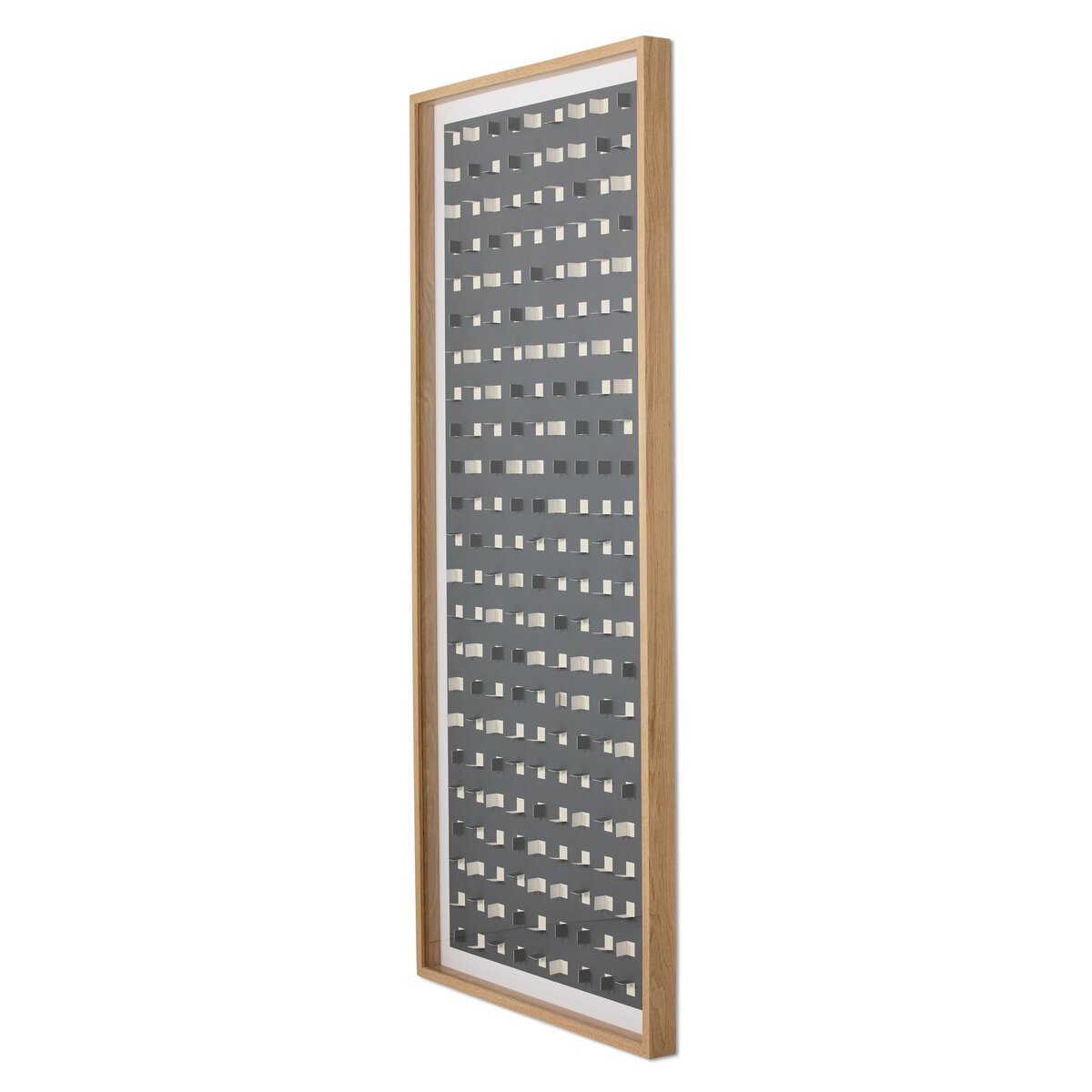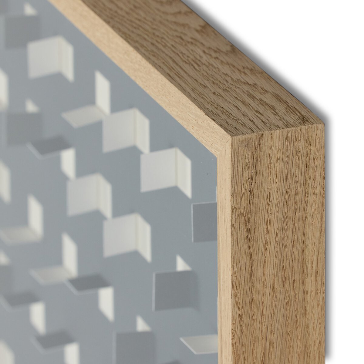 Overall Dimensions 48.00"w x 2.50"d x 48.00"hItem Number 237509-001Colors Vertical Grain 2.5 White Oak, Ivory, Clear Acrylic GlazingMaterials Vertical Grain White Oak, Linen Backer, Acrylic GlazingWeight 25.00 lbVolume 8.12 cu ft