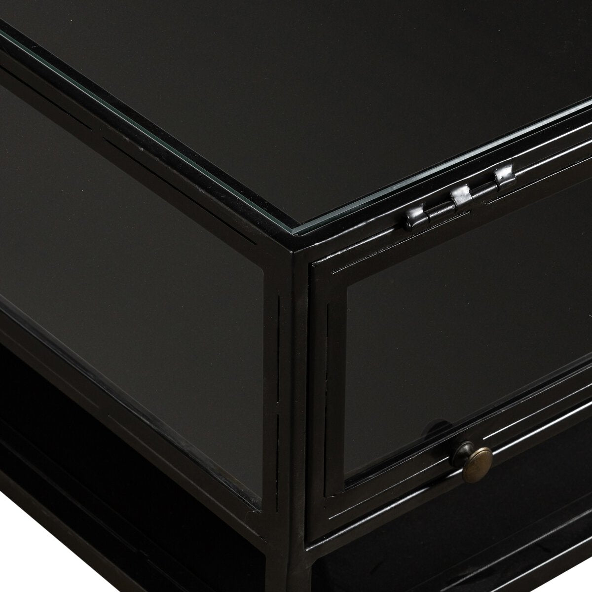 Overall Dimensions 54.25"w x 30.00"d x 16.25"hItem Number VBEL-F038Colors Tempered Glass, BlackMaterials Tempered Glass, IronWeight 150.13 lbVolume 25.96 cu ftClearance from Floor 1 2.83"Distance between Legs (Front to Back) 1 28.35"Distance between Legs (Side to Side) 1 25.98"Door Height 1 7.48"Door Thickness 1 0.39"Door Width 1 28.74"Fixed Shelf Depth 1 29.92"Fixed Shelf Height 1 0.79"Fixed Shelf Width 1 53.94"Interior Section Depth 1 29.92"Interior Section Depth 2 29.92"Interior Section Height 1 7.48"Interior Section Height 2 3.94"Interior Section Width 1 53.94"Interior Section Width 2 53.94"Leg/Base Depth 1 29.92"Leg/Base Height 1 16.14"Leg/Base Width 1 53.94"Tabletop Thickness 0.31"Drawer Glide Type NoneDrawer Stop Material NoneFixed Shelf Qty 1.00Fixed Shelves YesFunctionality ShelvesHas Leveler YesInterior Section Quantity 2.00Protective Feet Leg LevelersShape Type RectangleSuite Shadow BoxWeight Capacity 100 lb