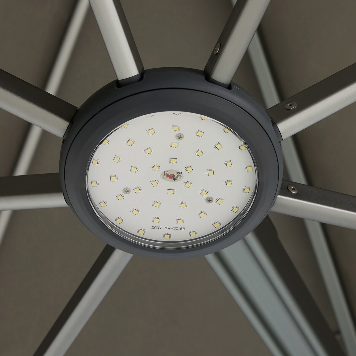 Overall Dimensions 208.50"w x 110.50"d x 115.50"hItem Number 248386-001Colors Oyster, Grey Steel, Stainless SteelMaterials 100% Acrylic, Stainless SteelWeight 164.20 lbVolume 24.19 cu ftClosed Canopy Height 80.59"Closed Overall Width 23.46"Leg/Base Height 1 0.50"Leg/Base Width 1 12.60"Open Canopy Height 27.01"Pole Height 115.47"Canopy Ribs Qty 16.00Cleaning Code