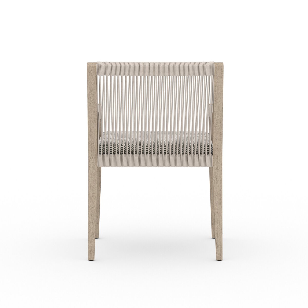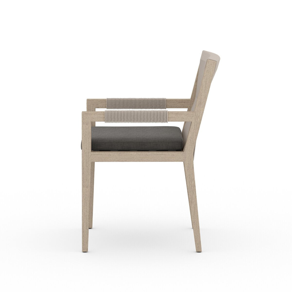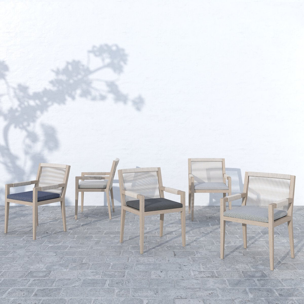 Overall Dimensions 22.75"w x 24.50"d x 34.00"hItem Number 223831-006Colors Faye Sand, Washed Brown-FSC, Grey RopeMaterials 100% Olefin, Solid FSC®-Certified Teak, 100% PolypropyleneWeight 20.59 lbVolume 15.54 cu ftArm Height from Floor 24.80"Arm Height from Seat 7.10"Arm Length 19.50"Arm Width 1.60"Clearance from Floor 1 15.90"Distance between Legs (Front to Back) 1 20.90"Distance between Legs (Side to Side) 1 18.90"Seat Back Height 16.20"Seat Cushion Depth 1 17.30"Seat Cushion Thickness 1 1.20"Seat Cushion Width 1 19.30"Seat Depth 1 17.30"Seat Height 1 18.90"Seat Width (Back) 19.30"Seat Width (Front) 19.30"Seat Width 1 19.30"Chair Arm Option With ArmCleaning Code