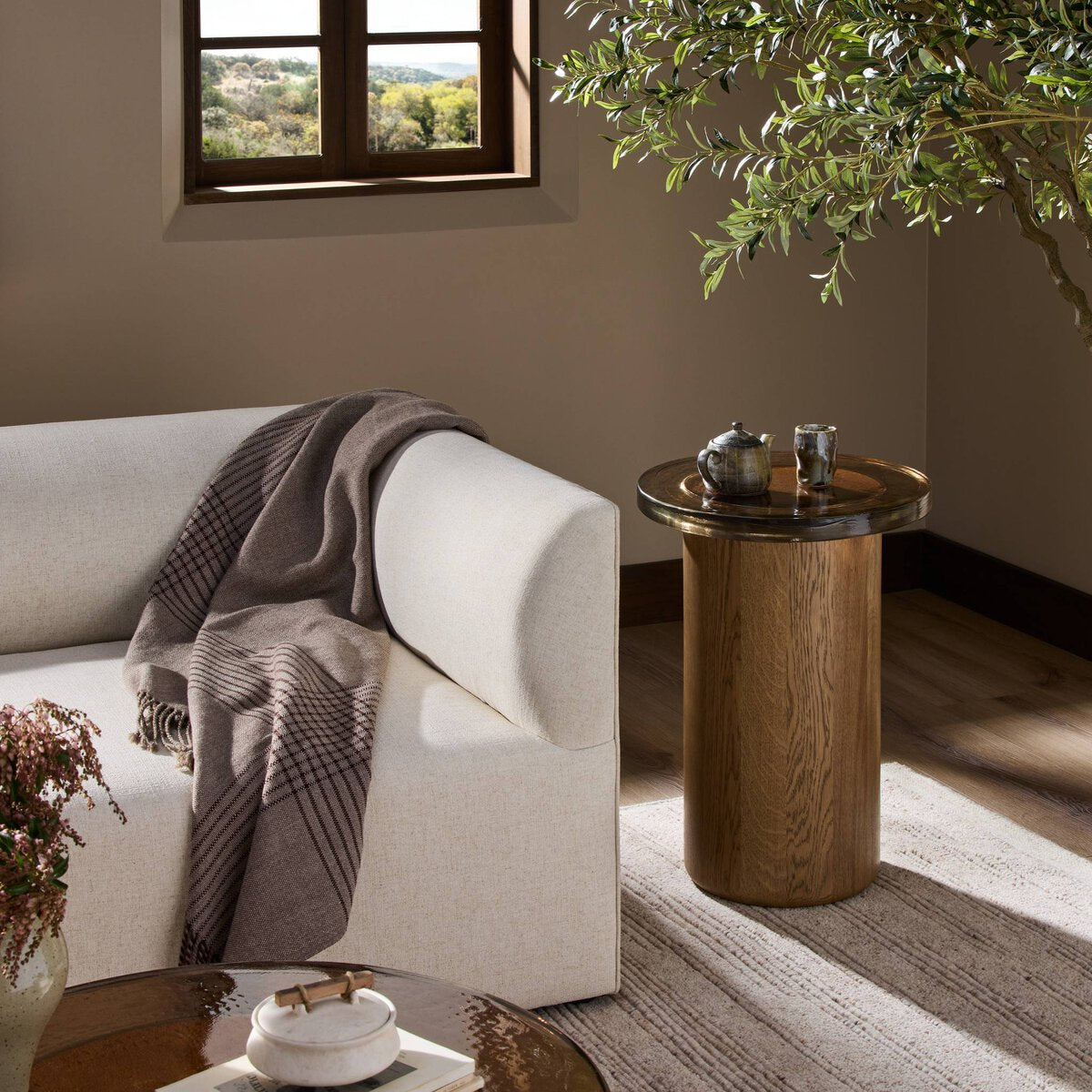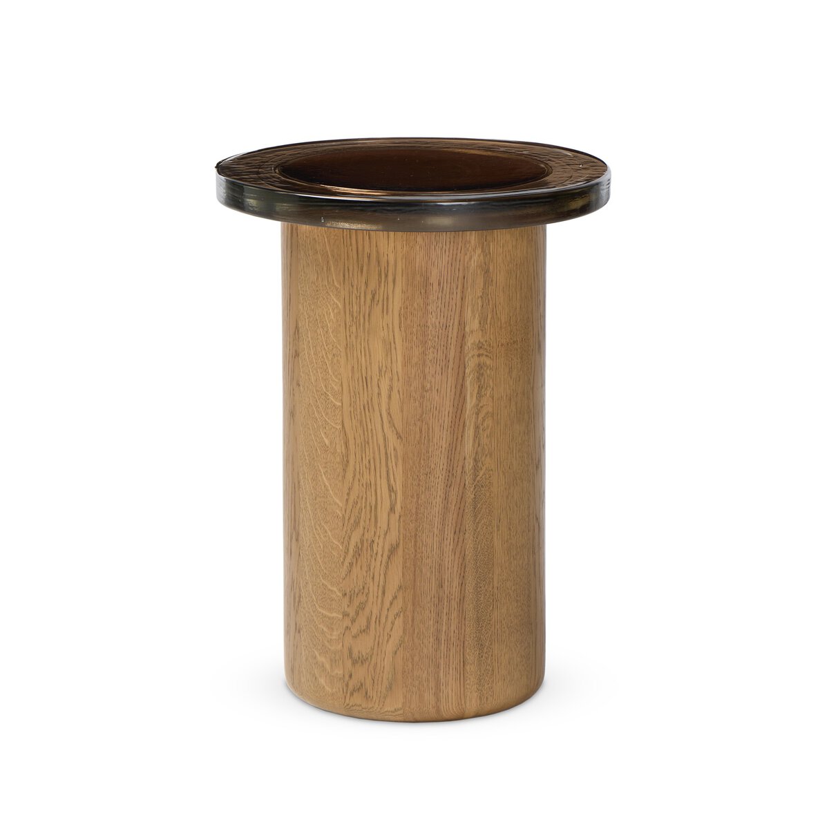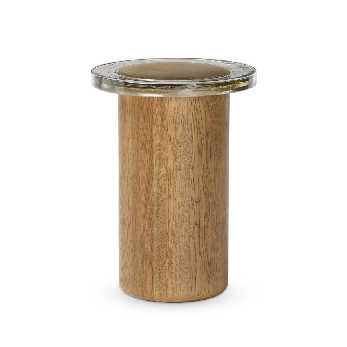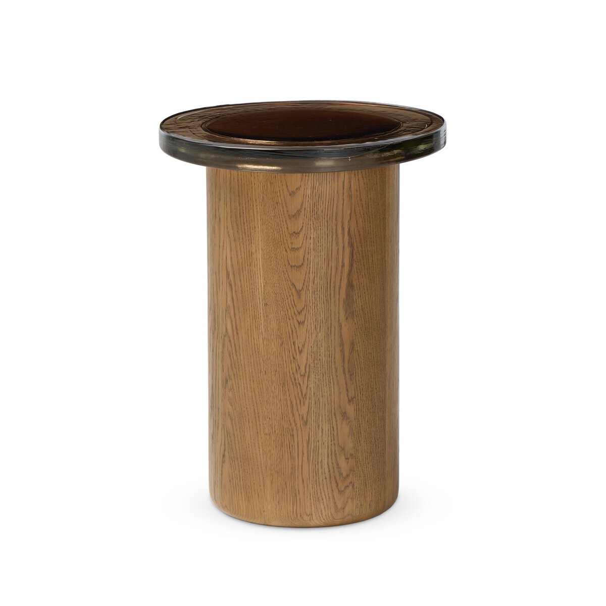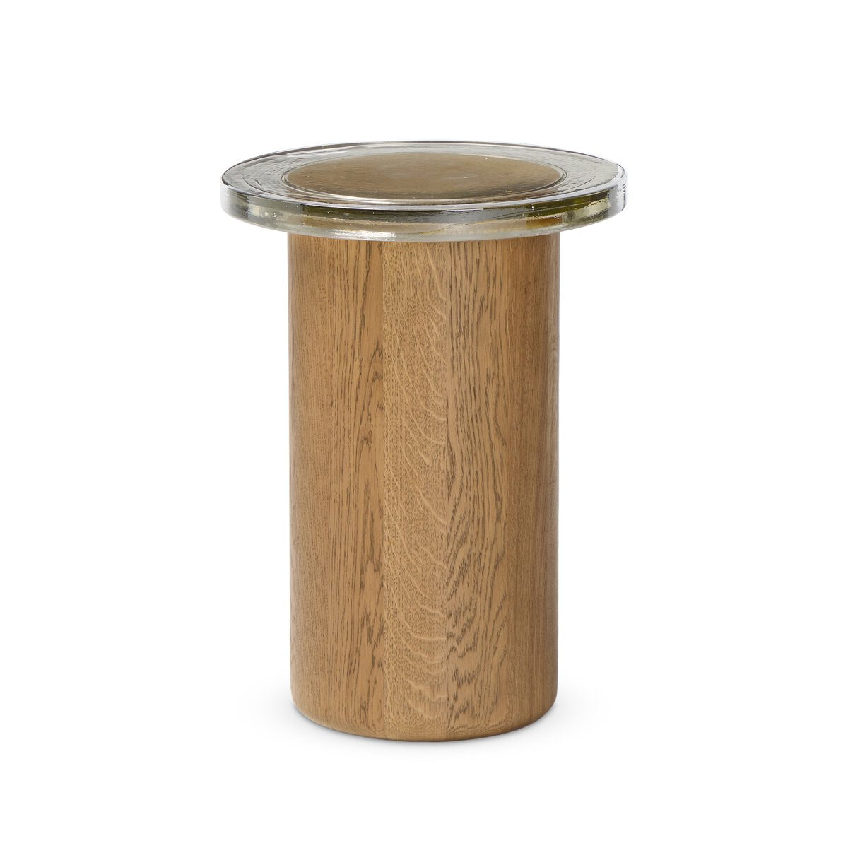 Overall Dimensions 18.00"w x 18.00"d x 24.75"hItem Number 250697-001Colors Clear Cast Glass, Light Brown OakMaterials Cast Glass, Solid OakWeight 56.88 lbVolume 5.37 cu ftClearance from Floor 1 23.60"Leg/Base Depth 1 12.00"Leg/Base Height 1 23.60"Leg/Base Width 1 12.00"Overhang Width 1 3.00"Tabletop Thickness 1.57"Drawer Glide Type NoneDrawer Stop Material NoneFrame Construction Joinery Edge Banded VeneerFunctionality NoneHas Leveler YesProtective Feet Leg LevelersShape Type RoundSuite ShiraWeight Capacity 100 lb