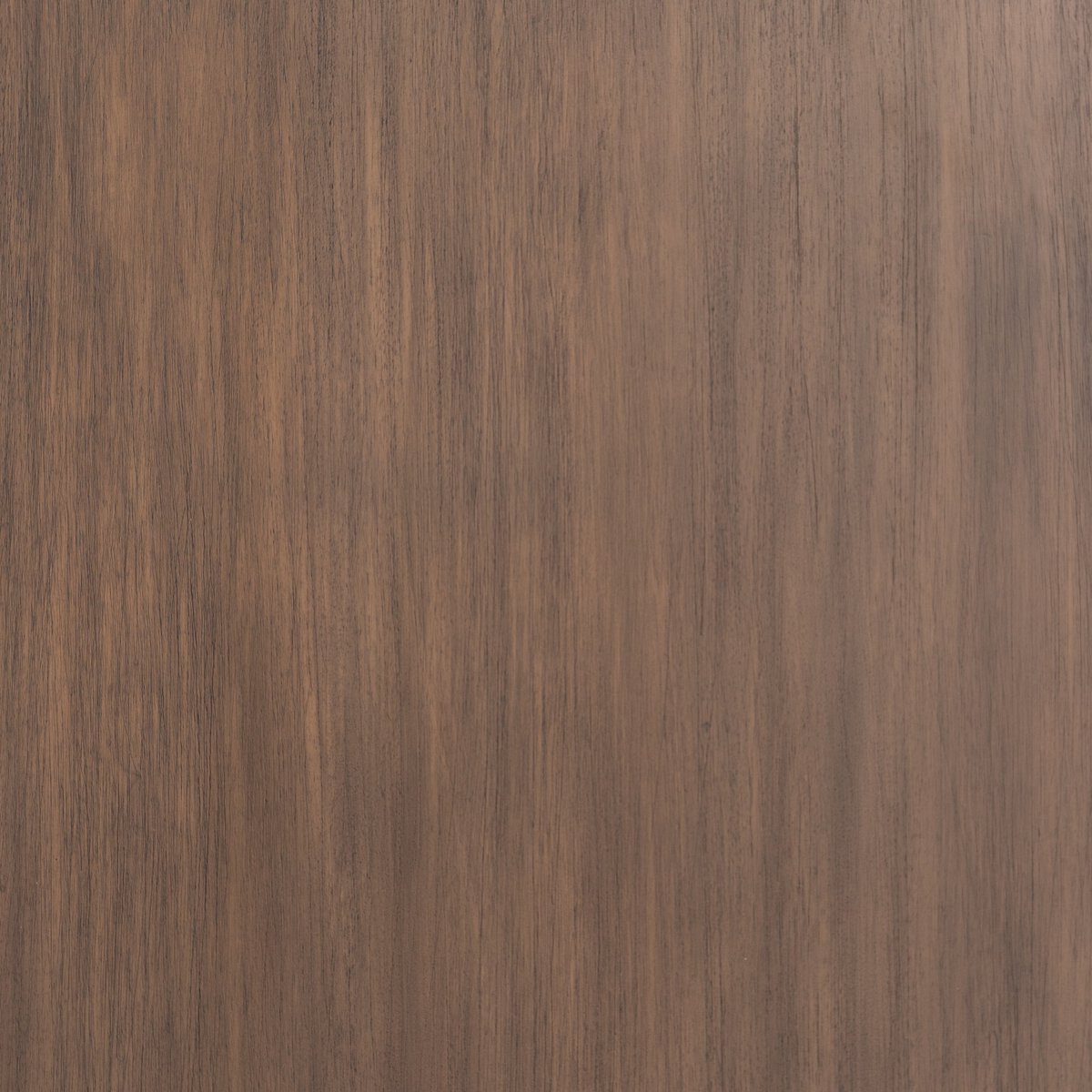 Solid mahogany is finished in a warm espresso, with vertical reeding for a linear look. Plinth base, rounded corners and iron hardware finished in an antique brass reflect midcentury inspiration.