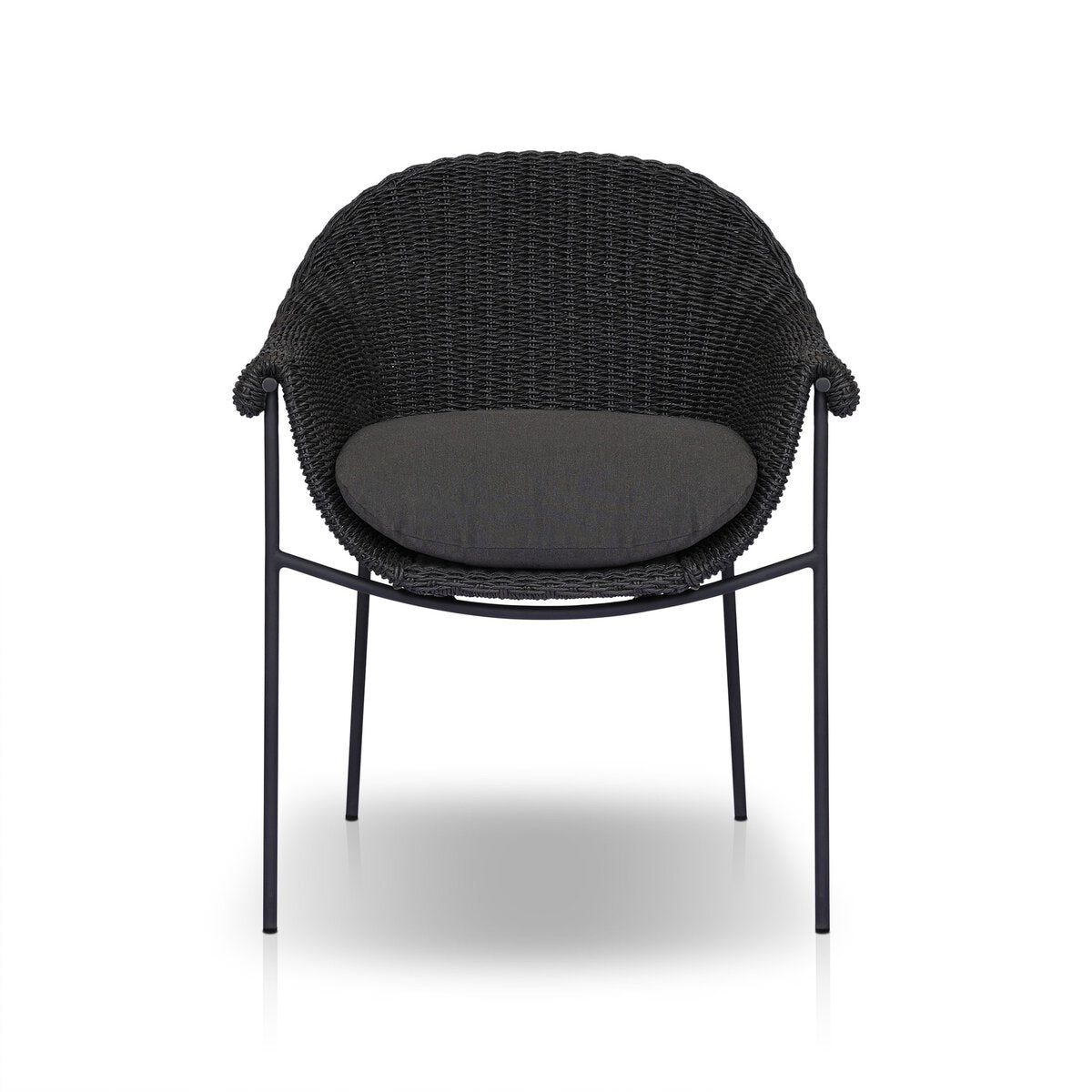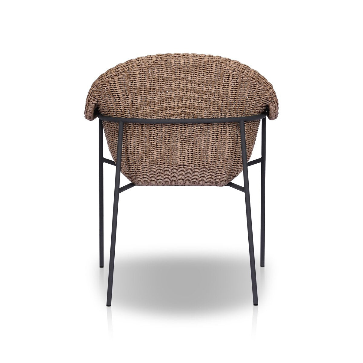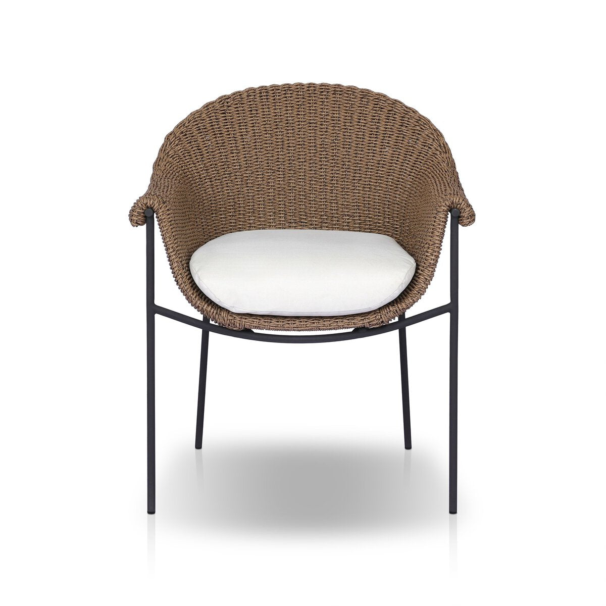With a curvy silhouette and classic rolled arms, a woven frame brings modern sensibility to this vintage-inspired outdoor dining chair, with an airy iron cradle base for a beautiful balance of scale. Paired with a fully upholstered cushion for a comfortable sit. Cover or store indoors during inclement weather and when not in use.