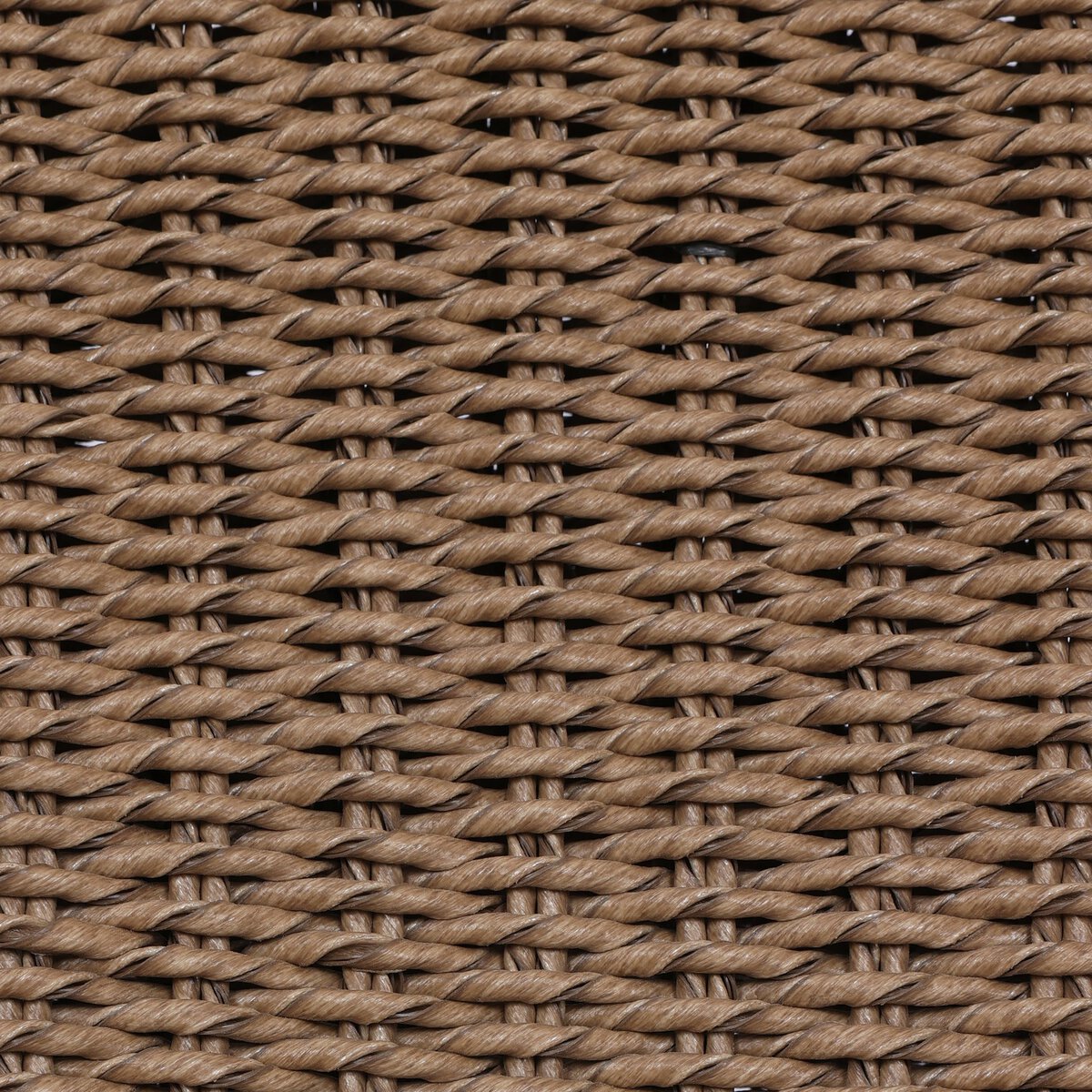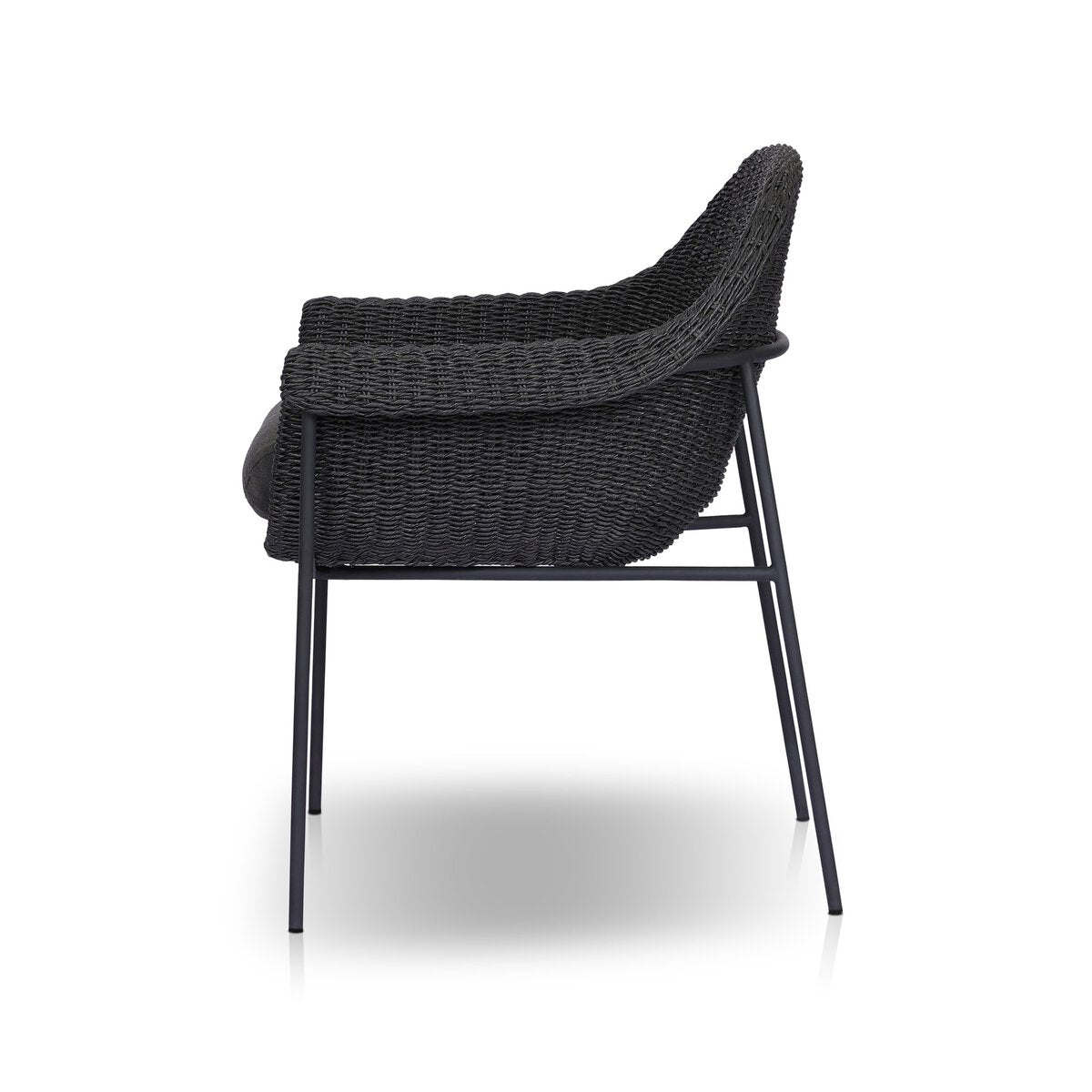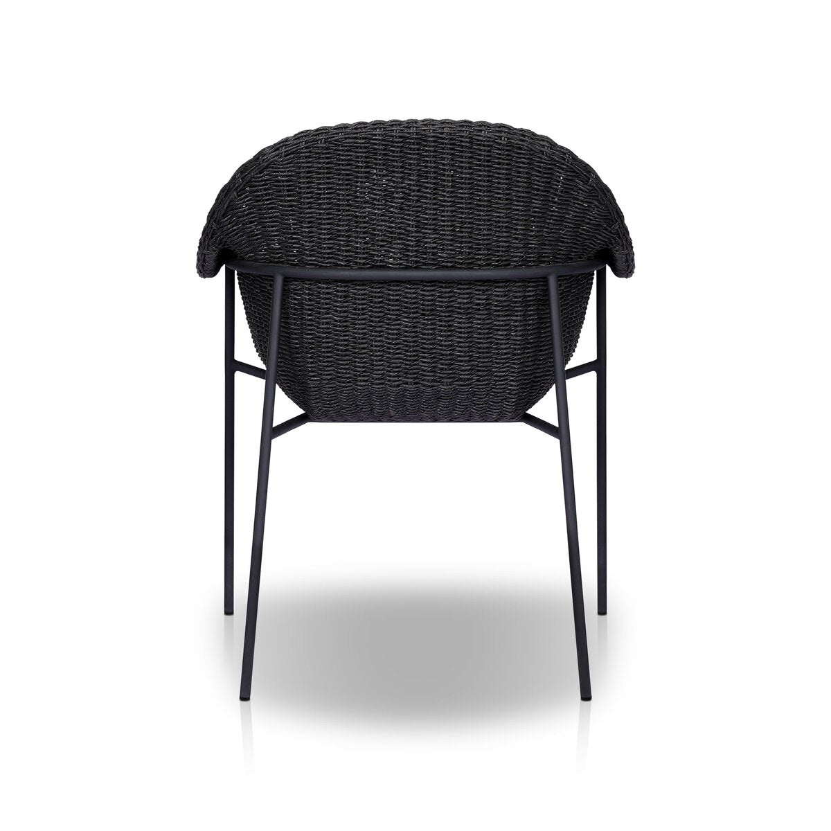 With a curvy silhouette and classic rolled arms, a woven frame brings modern sensibility to this vintage-inspired outdoor dining chair, with an airy iron cradle base for a beautiful balance of scale. Paired with a fully upholstered cushion for a comfortable sit. Cover or store indoors during inclement weather and when not in use.