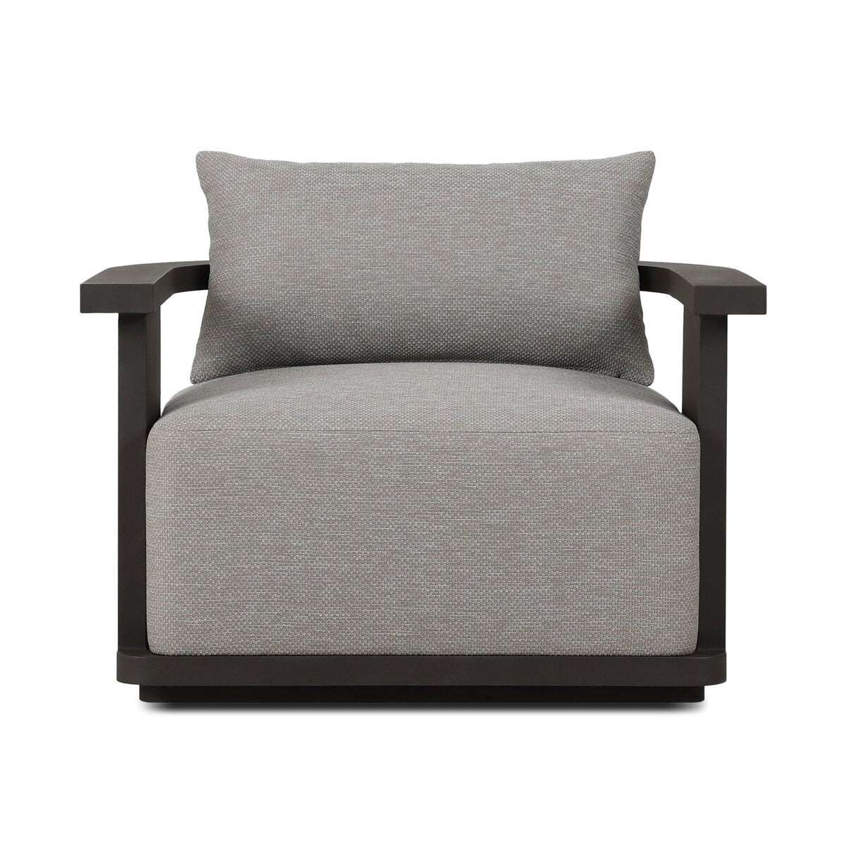 An outdoor armchair features a distinctive 360-swivel design and curved seat back, crafted from bronzed aluminum. Thick box cushioning is upholstered in a specialized high-performance fabric. Sustainably made with zero waste, luxurious Italian upholstery places a new and unique spin on indoor/outdoor seating, offering soft, durable fabric that's highly resistant to sun, stains, mold and abrasion. Cover or store indoors during inclement weather and when not in use.