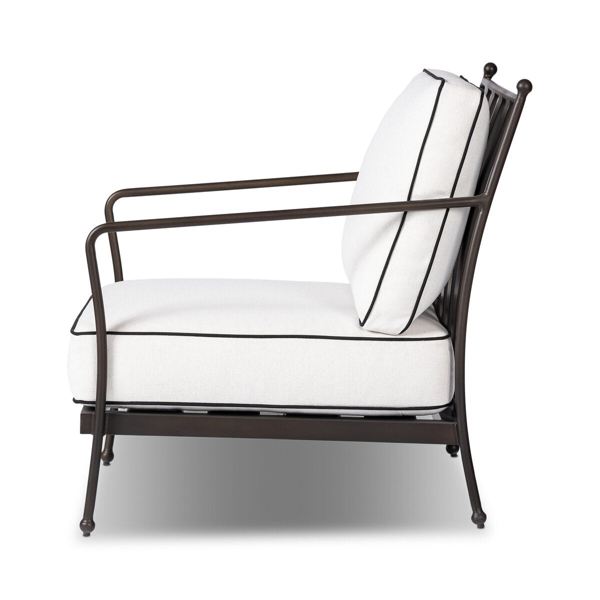Movement-driven shaping — with double seat cushioning for sink-in comfort — this outdoor chair brings a modern, French Deco-inspired look to the patio. Traditional vertical slats on the back pair with small finial details on the feet for a unique take on traditional. Cover or store indoors during inclement weather and when not in use.