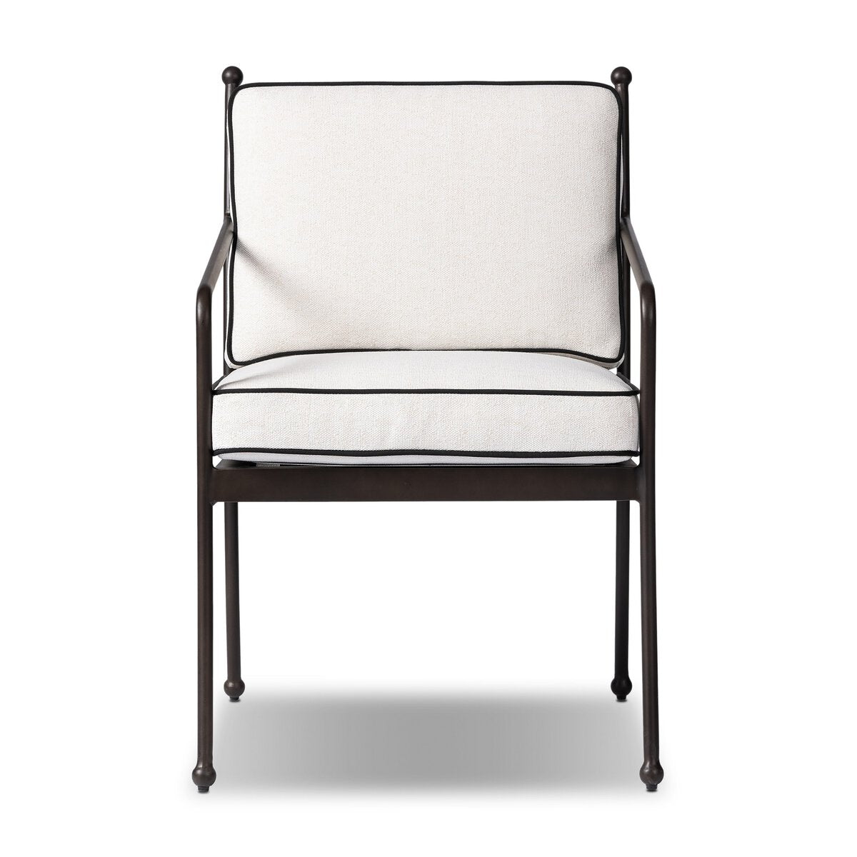 Movement-driven shaping — with double seat cushioning for sink-in comfort — this outdoor dining armchair brings a modern, French Deco-inspired look to the patio. Traditional vertical slats on the back pair with small finial details on the feet for a unique take on traditional. Cover or store inside during inclement weather and when not in use.