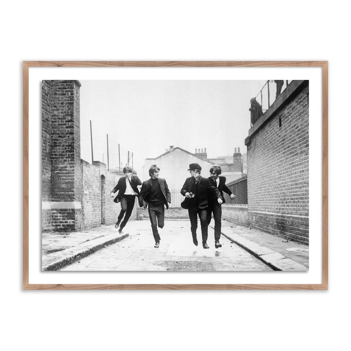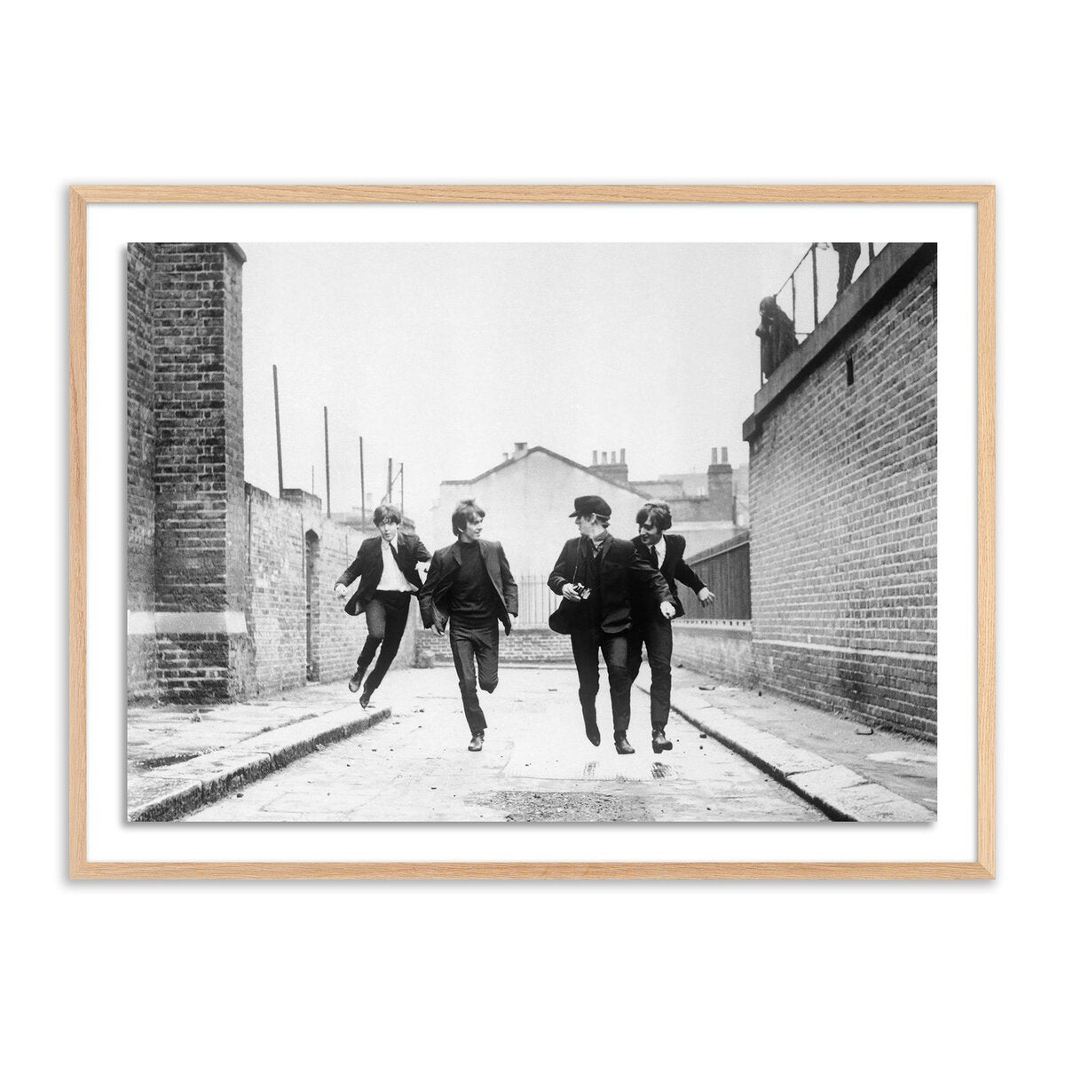 From left to right, Paul McCartney, George Harrison, John Lennon, and Ringo Starr run down an empty London street in a scene from the movie A Hard Day's Night, 1964. Courtesy of Getty Images. Printed on premium photo paper and float-mounted within a 100% American maple frame. Handmade in Austin, Texas, each print includes a certificate of authenticity commemorating the exclusive partnership between Getty Images and Four Hands Art Studio.