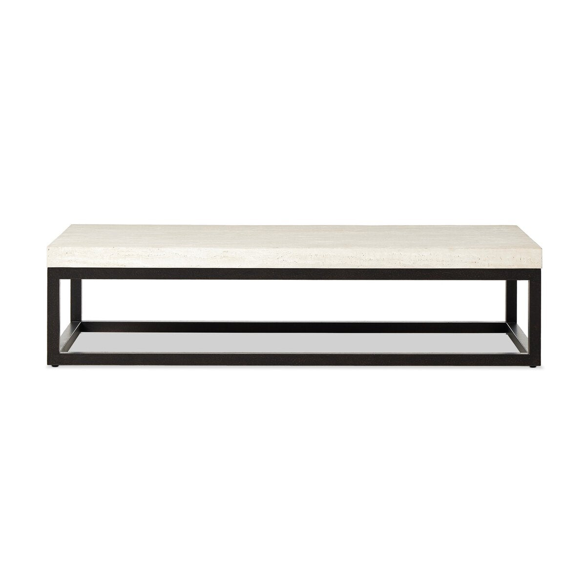 Airy while substantial, for an intriguing balance of scale. Bronzed iron forms an open, angular frame for a rectangular tabletop of solid white travertine. By the makers at Van Thiel, known for their antique-inspired pieces and hand-applied finishes.