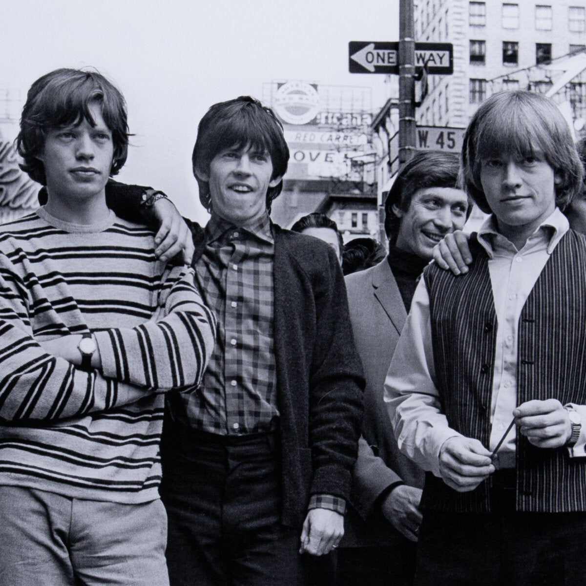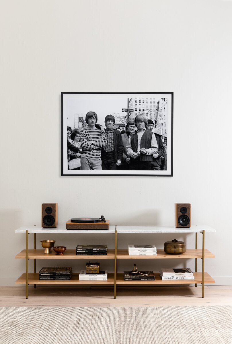 Renowned British rock band the Rolling Stones, photographed in New York City by William Lovelace courtesy of Getty Images. Float-mounted and framed within black-finished American maple for a museum-quality look. Handmade in Austin, Texas, each print includes a certificate of authenticity commemorating the exclusive partnership between Getty Images and Four Hands Art Studio.