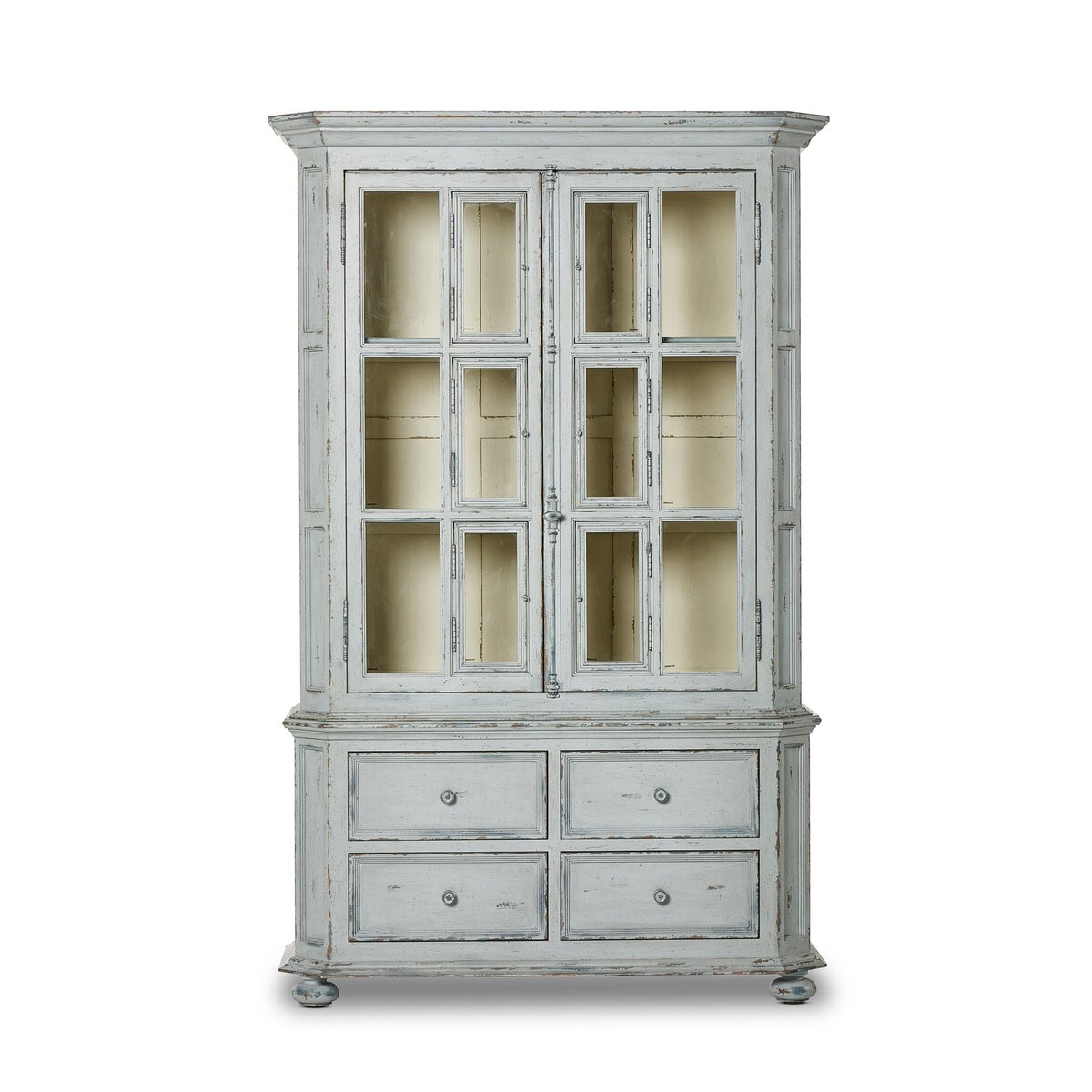Overall Dimensions 59.00"w x 21.50"d x 93.50"hItem Number 238292-002Colors Distressed Grey BlueMaterials Solid PoplarWeight 407.85 lbVolume 96.59 cu ftClearance from Floor 1 3.46"Distance between Pin Placements 1.97"Door Height 1 54.41"Door Thickness 1 1.10"Door Width 1 20.55"Drawer Depth 1 11.42"Drawer Height 1 7.60"Drawer Width 1 19.45"Interior Section Depth 1 15.24"Interior Section Height 1 54.02"Interior Section Width 1 50.63"Removable Shelf (Fixed or Adjustable) Depth 1 15.24"Removable Shelf (Fixed or Adjustable) Height 1 0.75"Removable Shelf (Fixed or Adjustable) Width 1 50.63"Cabinet Storage Type DisplayDoor Closure Catch Type Roller CatchDoor Qty 2.00Door Type HingedDrawer Glide Color BlackDrawer Glide Type Undermount MetalDrawer Quantity 4.00Drawer Stop Material WoodFrame Construction Joinery Edge Banded VeneerFunctionality DoorsFunctionality DrawersFunctionality ShelvesHas Soft Close Drawers YesHinge Type BarrelInterior Section Quantity 1.00Protective Feet Leg LevelersRecommended Shelf Capacity (kg) 18.14Recommended Shelf Capacity (lbs) 40.00Removable Shelf YesRemovable Shelf Adjustable? YesRemovable Shelf Qty 3.00Shape Type SingleSuite The "You Will Need A Lot Of Hinges"