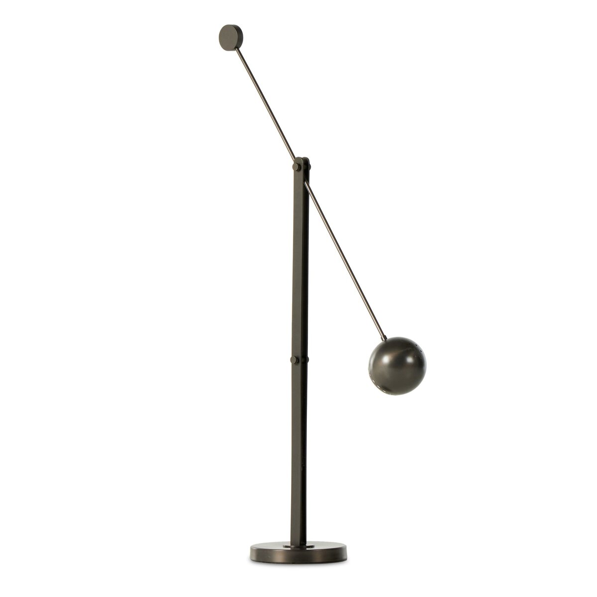 A study in shapes. A perforated spherical shade seems to balance effortlessly on a slim arm and base. Crafted from stainless steel in a dark antique brass finish.