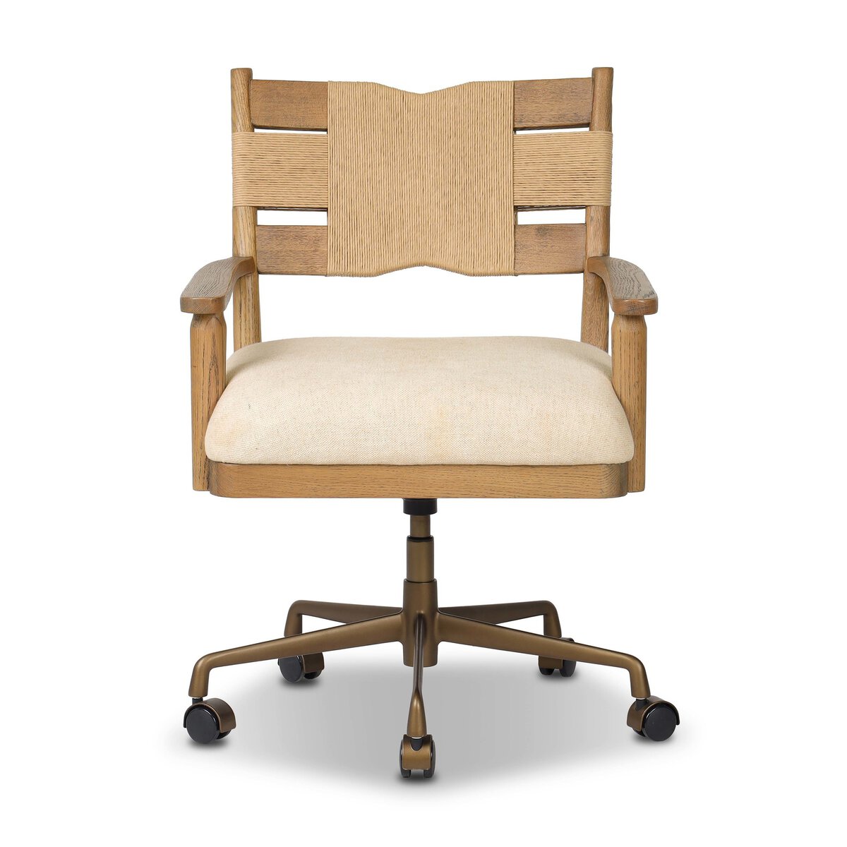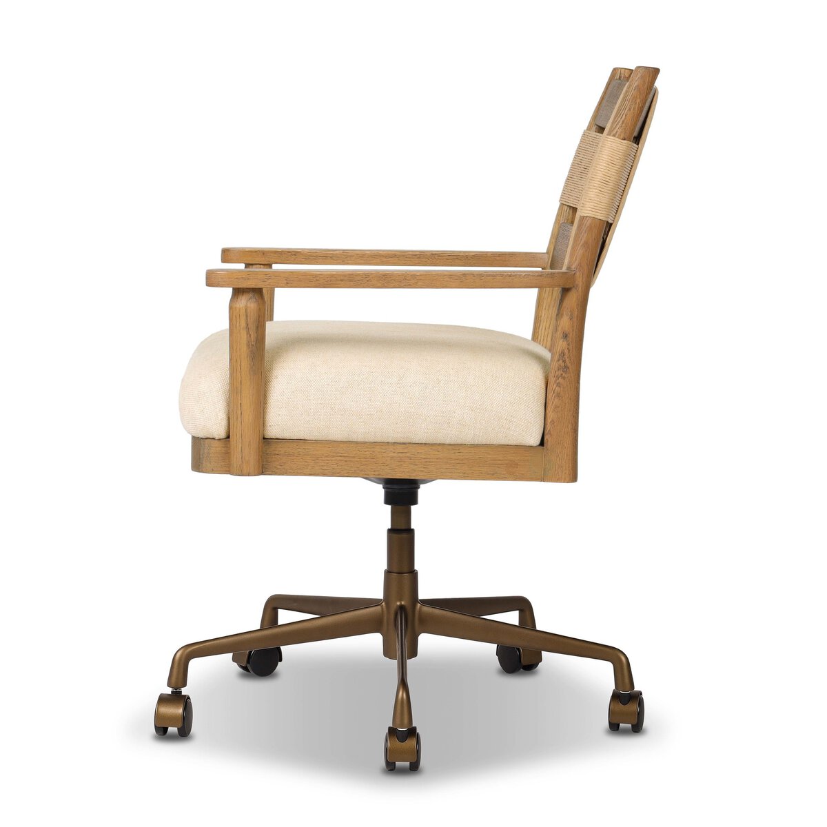 Overall Dimensions 24.50"w x 24.50"d x 34.25"hItem Number 251172-001Colors Natural Paper Cord, Brushed Brass Aluminum, Bergamo ParchmentMaterials Rush, Aluminum, 75% Cotton, 25% Flax/LinenWeight 28.66 lbVolume 9.85 cu ftArm Height from Floor 24.75"Arm Height from Seat 4.25"Arm Length 18.00"Arm Width 2.25"Clearance from Floor 1 14.00"Seat Back Height 13.75"Seat Depth 1 20.00"Seat Height 1 20.50"Seat Width (Back) 18.75"Seat Width (Front) 19.75"Adjustable YesCasters 360-degree spinChair Arm Option With ArmCleaning Code