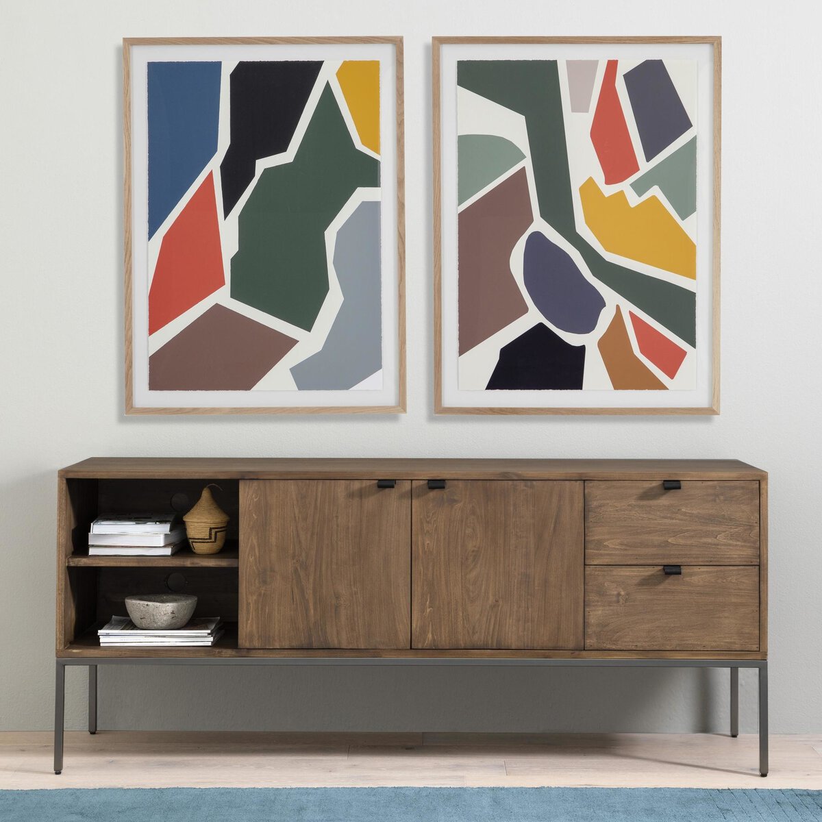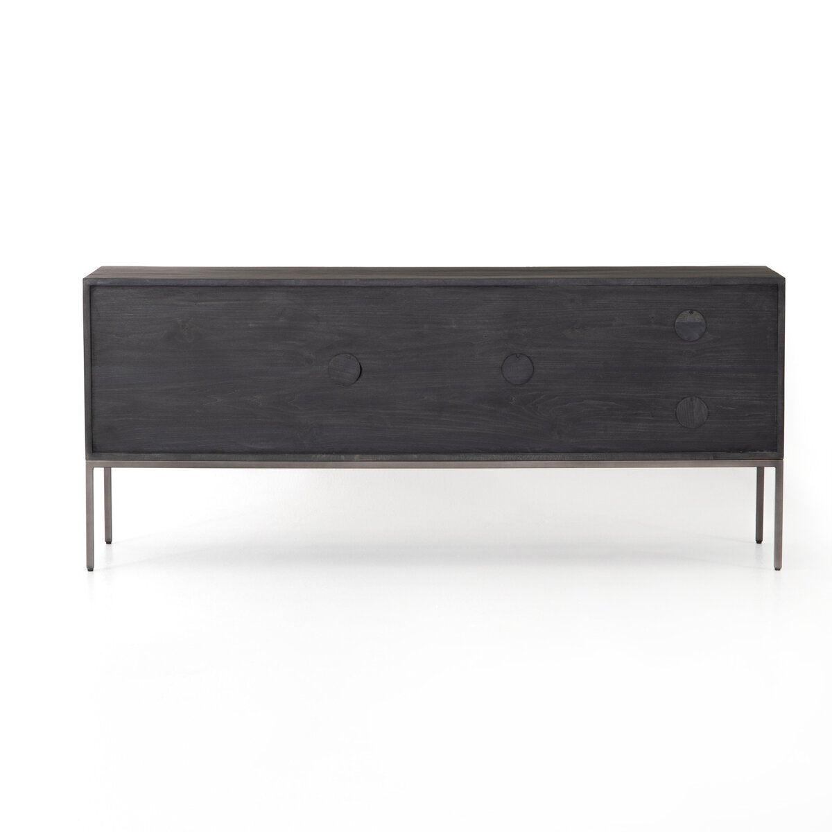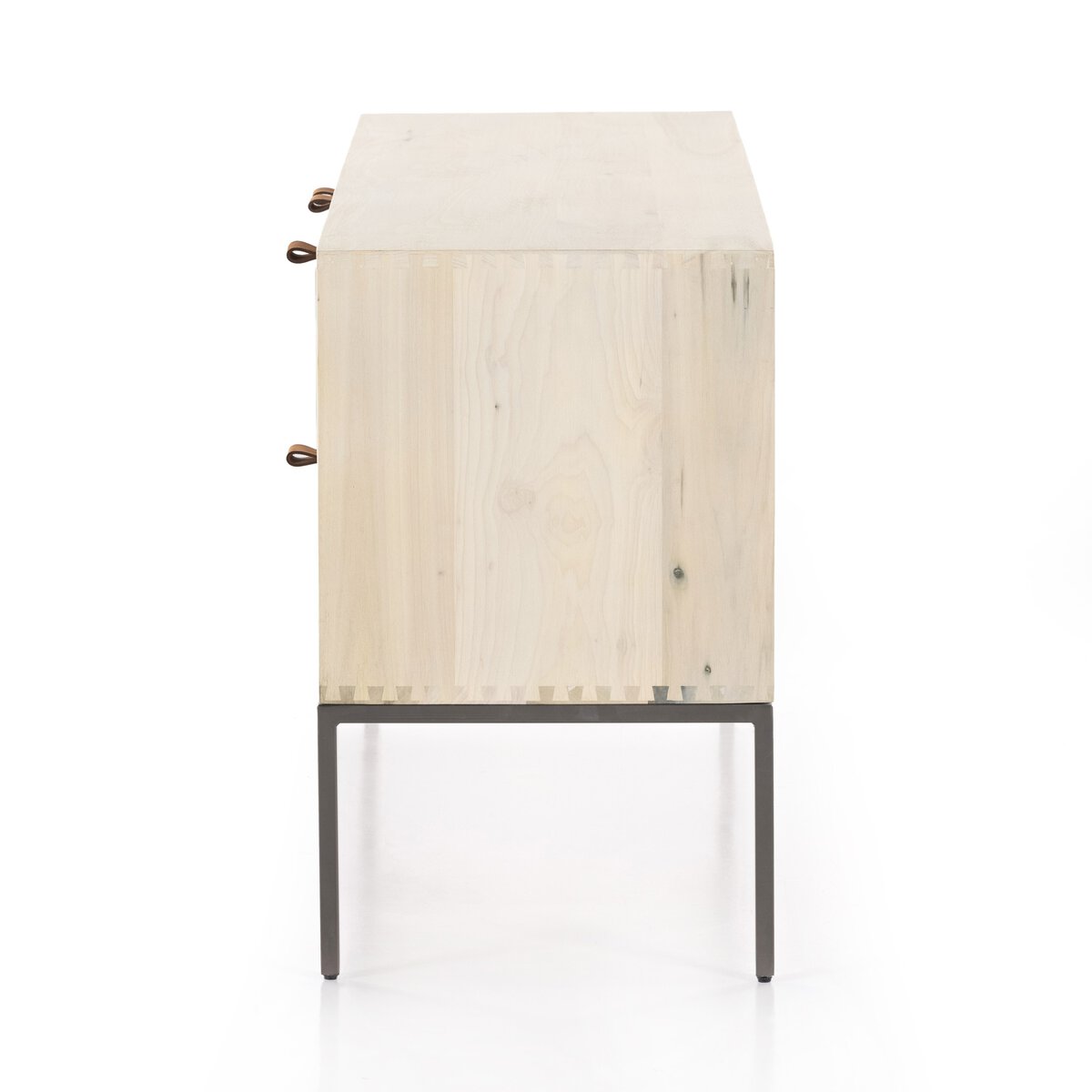 Overall Dimensions 69.00"w x 18.00"d x 29.25"hItem Number 107315-005Colors Dove Poplar, Toffee LeatherMaterials Solid Poplar, Top Grain LeatherWeight 113.54 lbVolume 32.24 cu ftClearance from Floor 1 10.24"Distance between Pin Placements 4.33"Door Height 1 16.54"Door Thickness 1 0.79"Door Width 1 16.85"Drawer Depth 1 14.37"Drawer Height 1 6.69"Drawer Width 1 15.43"Fixed Shelf Depth 1 16.34"Fixed Shelf Height 1 0.79"Fixed Shelf Width 1 16.85"Interior Section Depth 1 16.34"Interior Section Depth 2 15.94"Interior Section Depth 3 15.94"Interior Section Depth 4 16.34"Interior Section Height 1 7.99"Interior Section Height 2 16.54"Interior Section Height 3 16.54"Interior Section Height 4 7.99"Interior Section Width 1 16.85"Interior Section Width 2 15.75"Interior Section Width 3 15.75"Interior Section Width 4 16.85"Removable Shelf (Fixed or Adjustable) Depth 1 13.70"Removable Shelf (Fixed or Adjustable) Height 1 0.79"Removable Shelf (Fixed or Adjustable) Width 1 15.75"Cord Management YesDoor Closure Catch Type MagneticDoor Qty 2.00Door Type HingedDrawer Glide Color WoodDrawer Glide Type Sidemount WoodDrawer Joinery English DovetailDrawer Quantity 2.00Drawer Stop Anti Tip Rail YesDrawer Stop Material WoodFixed Shelf Qty 1.00Fixed Shelves YesFrame Construction Joinery English DovetailFrame Construction Joinery Pocket Joint with ScrewsFrame Construction Joinery Tongue and GrooveFunctionality DoorsFunctionality DrawersFunctionality ShelvesHinge Type CabinetryInterior Section Quantity 4.00Protective Feet Leg LevelersRecommended Shelf Capacity (kg) 18.14Recommended Shelf Capacity (lbs) 40.00Removable Shelf YesRemovable Shelf Adjustable? YesRemovable Shelf Qty 2.00Suite Trey