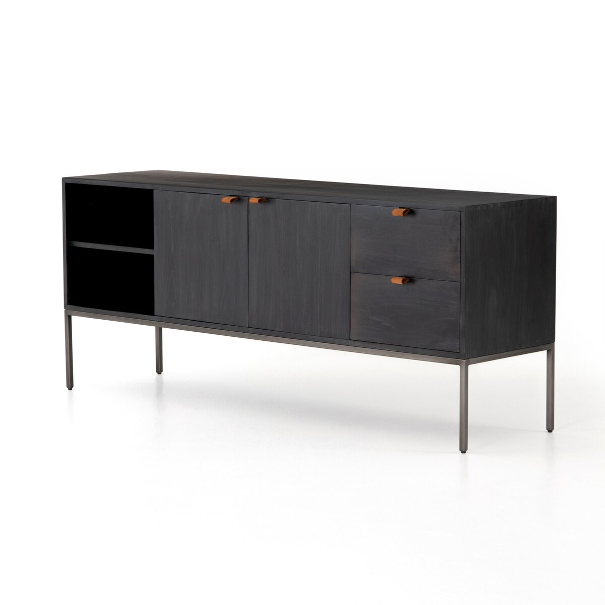 Inspired by clean midcentury design, a stylish console of light-washed solid poplar offers plenty of media storage space by way of roomy cabinetry, open shelving and dual drawers. Metal-secured pulls of top-grain leather add a textural element of surprise. Great solo or paired with matching bookcases for even more storage.