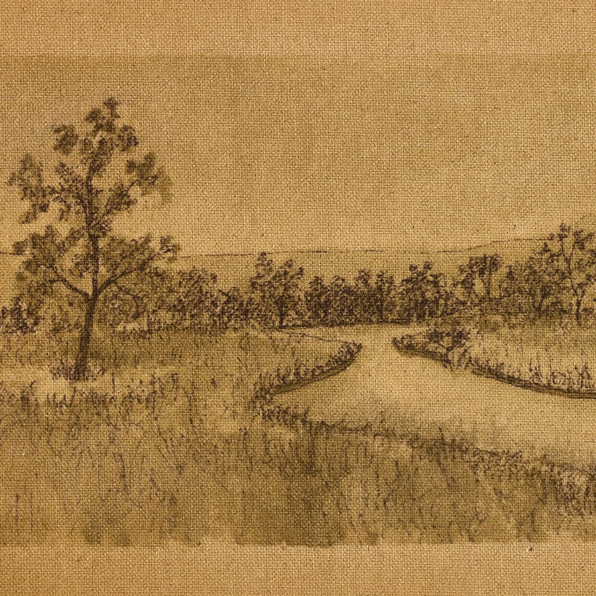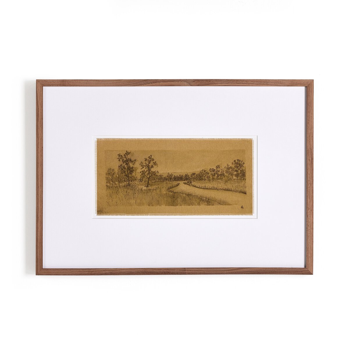 Inspired by the Texas Hill Country, Austin-based artist and registered nurse Aileen Fitzgerald paints atmospheric landscapes reminiscent of early Impressionism with a heavy emphasis on light. Raw canvas with a stringed edge is float mounted with an oversized matte, finished in a rustic walnut frame with acrylic glazing. Handmade in Austin, Texas.