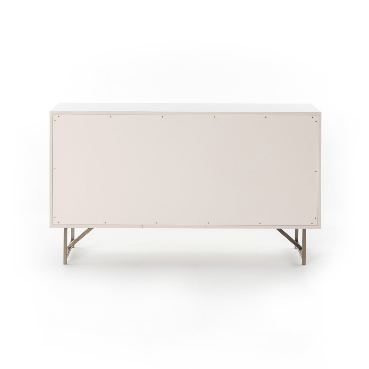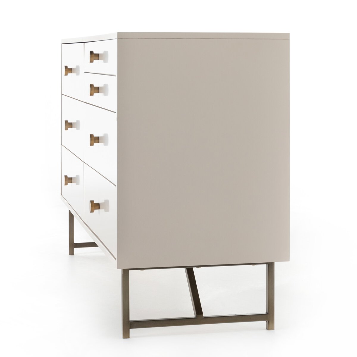 Overall Dimensions 58.00"w x 19.00"d x 33.00"hItem Number 104494-002Colors Matte Alabaster, Aged Brass, Golden BrassMaterials Engineered Hardwood, Stainless Steel, IronWeight 242.51 lbVolume 30.16 cu ftClearance from Floor 1 7.28"Drawer Depth 1 14.80"Drawer Depth 2 14.80"Drawer Height 1 5.71"Drawer Height 2 2.44"Drawer Width 1 26.06"Drawer Width 2 26.06"Door Type No DoorsDrawer Glide Type Sidemount MetalDrawer Joinery English DovetailDrawer Quantity 7.00Drawer Stop Material NoneFrame Construction Joinery Butt JointFrame Construction Joinery Corner-block/CleatFunctionality DrawersHas Leveler YesProtective Feet Leg LevelersShape Type WideSuite VanWeight Capacity 100 lb