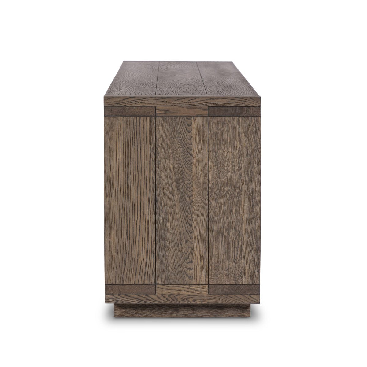 Overall Dimensions 94.00"w x 18.00"d x 26.00"hItem Number 236405-002Colors Worn Oak VeneerMaterials Oak Veneer, Solid OakWeight 239.86 lbVolume 43.44 cu ftDoor Height 1 19.50"Door Thickness 1 1.00"Door Width 1 15.25"Drawer Depth 1 12.75"Drawer Height 1 5.50"Drawer Width 1 25.00"Interior Section Depth 1 13.00"Interior Section Depth 2 13.00"Interior Section Height 1 19.50"Interior Section Height 2 19.50"Interior Section Width 1 32.00"Interior Section Width 2 32.00"Removable Shelf (Fixed or Adjustable) Depth 1 13.00"Removable Shelf (Fixed or Adjustable) Height 1 0.50"Removable Shelf (Fixed or Adjustable) Width 1 32.00"Cord Management YesDoor Closure Catch Type Push LatchDoor Qty 4.00Door Type HingedDrawer Glide Color SilverDrawer Glide Type Undermount MetalDrawer Joinery Butt JointDrawer Quantity 2.00Drawer Stop Anti Tip Rail YesDrawer Stop Material PlasticFrame Construction Joinery Mortise and TenonFunctionality DoorsFunctionality DrawersFunctionality ShelvesHas Leveler YesHas Soft Close Drawers YesHinge Type CabinetryInterior Section Quantity 2.00Protective Feet Leg LevelersRecommended Shelf Capacity (kg) 18.14Recommended Shelf Capacity (lbs) 40.00Removable Shelf YesRemovable Shelf Qty 2.00Suite Warby