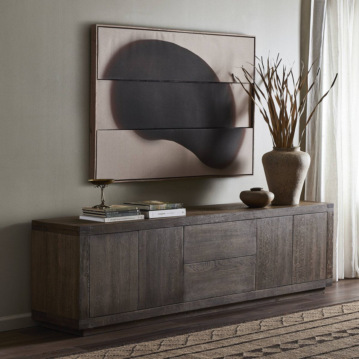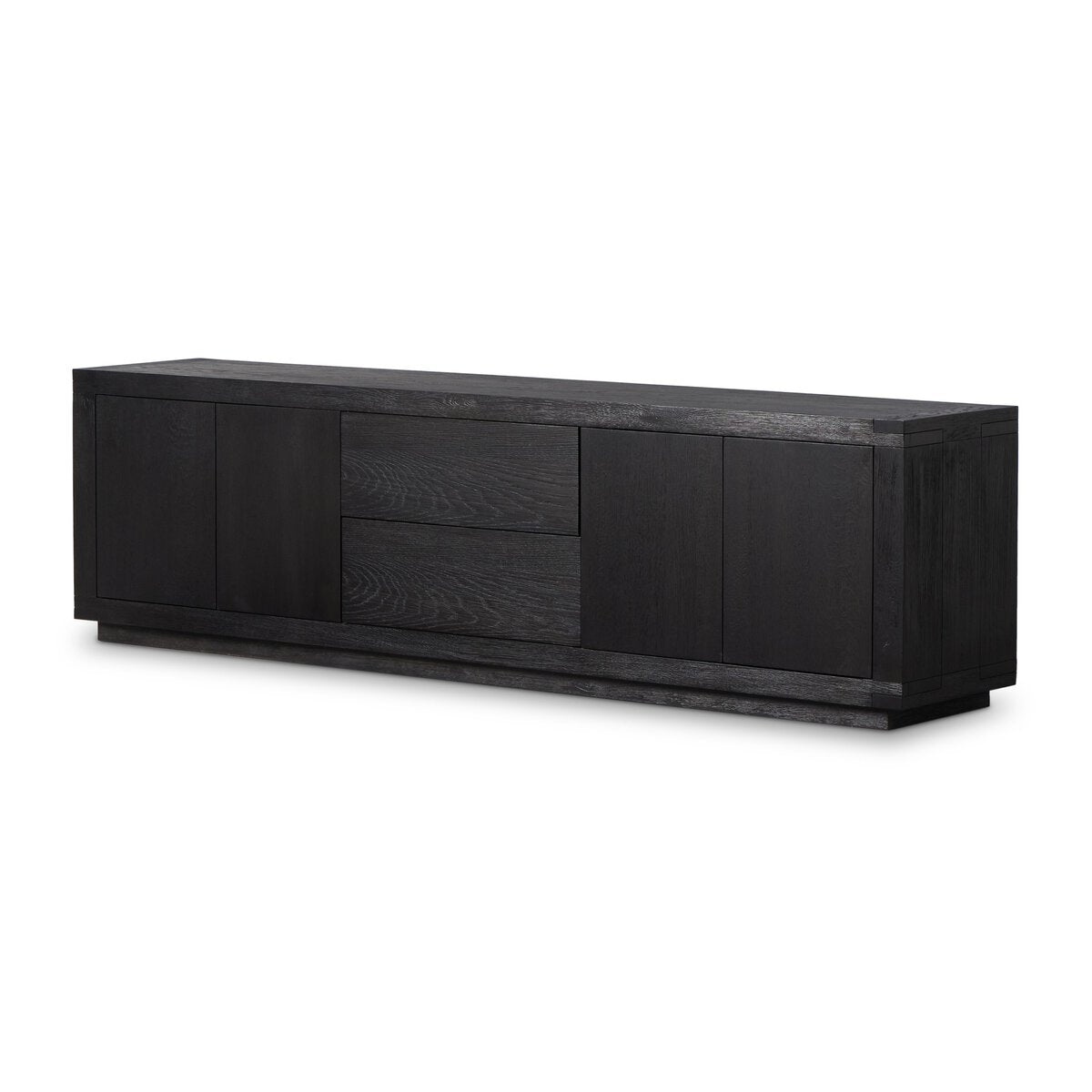 Overall Dimensions 94.00"w x 18.00"d x 26.00"hItem Number 236405-002Colors Worn Oak VeneerMaterials Oak Veneer, Solid OakWeight 239.86 lbVolume 43.44 cu ftDoor Height 1 19.50"Door Thickness 1 1.00"Door Width 1 15.25"Drawer Depth 1 12.75"Drawer Height 1 5.50"Drawer Width 1 25.00"Interior Section Depth 1 13.00"Interior Section Depth 2 13.00"Interior Section Height 1 19.50"Interior Section Height 2 19.50"Interior Section Width 1 32.00"Interior Section Width 2 32.00"Removable Shelf (Fixed or Adjustable) Depth 1 13.00"Removable Shelf (Fixed or Adjustable) Height 1 0.50"Removable Shelf (Fixed or Adjustable) Width 1 32.00"Cord Management YesDoor Closure Catch Type Push LatchDoor Qty 4.00Door Type HingedDrawer Glide Color SilverDrawer Glide Type Undermount MetalDrawer Joinery Butt JointDrawer Quantity 2.00Drawer Stop Anti Tip Rail YesDrawer Stop Material PlasticFrame Construction Joinery Mortise and TenonFunctionality DoorsFunctionality DrawersFunctionality ShelvesHas Leveler YesHas Soft Close Drawers YesHinge Type CabinetryInterior Section Quantity 2.00Protective Feet Leg LevelersRecommended Shelf Capacity (kg) 18.14Recommended Shelf Capacity (lbs) 40.00Removable Shelf YesRemovable Shelf Qty 2.00Suite Warby